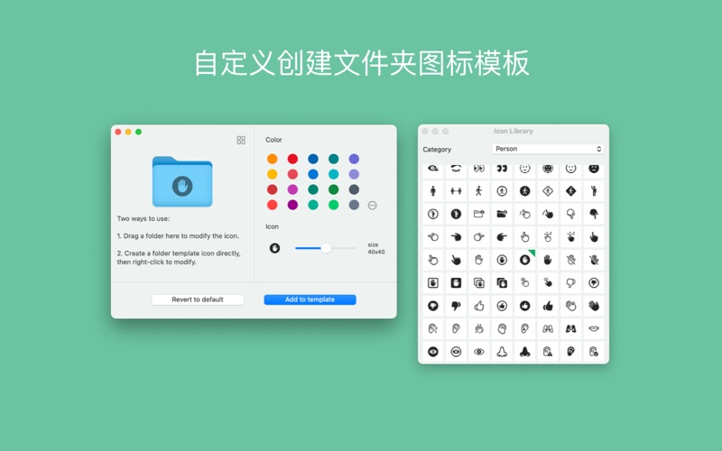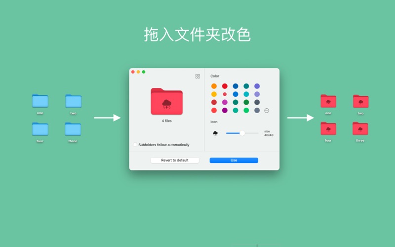 Folder by Color 是第2代文件夹改色小工具。 使用不同颜色的文件夹图标可以使您的文件看起来井井有条,从而提高文件管理效率。 你可以: 1. 创建文件夹模板,在 Mac 上用鼠标右键替换文件夹图标。 (推荐) 2. 将文件夹拖到Folder by Color,修改文件夹图标颜色,图标,然后应用。 特征 1. 用鼠标右键替换文件夹图标。 2. 支持批量修改文件夹颜色。 3. 子文件夹图标自动跟随。 4. 3000+图标供您选择。 1.优化文件夹改色速度 2.添加更多图标