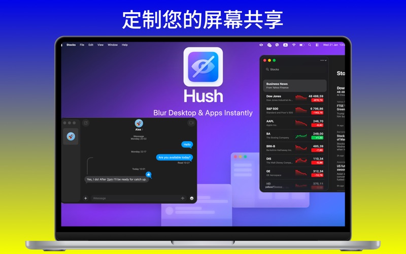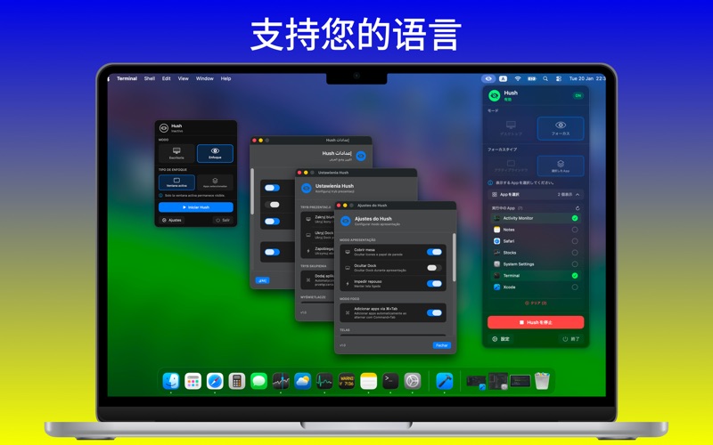屏幕共享时不再暴露杂乱的桌面和私人应用。Hush 一键提供即时演示模式。 两种强大模式 桌面模式 即时模糊或隐藏桌面图标。选择优雅的模糊效果、纯色或您自己的图片。杂乱消失——专业闪耀。 专注模式(新功能) 选择哪些应用保持可见——其他全部模糊。当您需要展示 Terminal 和 VS Code,但隐藏 Slack、Safari 和私人应用时非常完美。只需在菜单栏中勾选要显示的应用。 适用于 • 视频通话(Zoom、Meet、Teams) • 直播和屏幕录制 • 演示和演示 • 结对编程 • 教学和教程 • 任何重视隐私的人 主要功能 • 从菜单栏一键激活 • 专注模式:模糊除选定应用外的所有应用 • 桌面模式:模糊、颜色或图片叠加 • 自动隐藏 Dock 获得更干净的外观 • 全局快捷键随处可用 • 常驻菜单栏——无 Dock 图标杂乱 • 轻量级原生 macOS 应用 • 支持多显示器 • 隐私优先:不收集任何数据 为什么选择 HUSH? 与只能使背景窗口变暗的其他工具不同,Hush 让您: • 模糊特定应用,同时保持其他应用清晰 • 直接从菜单栏选择可见应用 • 在桌面和专注模式之间即时切换 无订阅。无账户。只是一个完美完成一件事的简单工具。 要求 • macOS 14.0(Sonoma)或更高版本 • 屏幕录制权限(专注模式需要) 隐私政策: https://poteam.pro/products/hush/policy 使用条款 (EULA): https://www.apple.com/legal/internet-services/itunes/dev/stdeula/