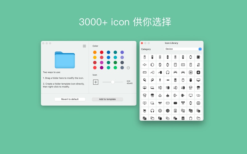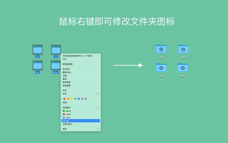 Folder by Color 是第2代文件夹改色小工具。 使用不同颜色的文件夹图标可以使您的文件看起来井井有条,从而提高文件管理效率。 你可以: 1. 创建文件夹模板,在 Mac 上用鼠标右键替换文件夹图标。 (推荐) 2. 将文件夹拖到Folder by Color,修改文件夹图标颜色,图标,然后应用。 特征 1. 用鼠标右键替换文件夹图标。 2. 支持批量修改文件夹颜色。 3. 子文件夹图标自动跟随。 4. 3000+图标供您选择。 1.优化文件夹改色速度 2.添加更多图标