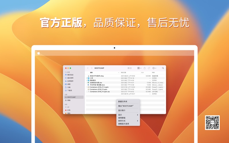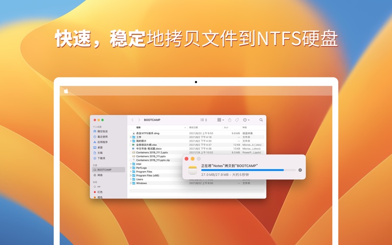 专业的NTFS for Mac软件,让你快速,稳定地在Mac上读写NTFS磁盘。 运行软件,它会自动探测NTFS磁盘并挂载成读写模式,然后在访达中操作NTFS磁盘,比如删除文件,修改文件,拷贝文件等。 此赤友NTFS助手包为终身升级。 在操作完NTFS磁盘后,点击本软件中的弹出铵钮安全弹出硬盘,这样操作可以避免文件或磁盘损坏。 特色功能: 1. 兼容BootCamp分区 2. 支持标记颜色 3. 支持隔空投送 4. 兼容Apple silicon M1/M2 Mac 5. 快速,稳定 6. 格式化NTFS 兼容macOS Sonoma 14