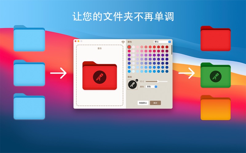 多彩文件夹- 让您的文件夹与众不同! 寻找一种简单而又有趣的方法来个性化您的 macOS 文件夹?多彩文件夹是您的完美选择!与标准的蓝色文件夹相比,我们提供了上千种鲜艳的颜色和多种渐变色供您选择,让您的文件夹看起来更加独特和引人注目。 不仅如此,我们还为您提供了超过3000个精美的图标,让您可以在文件夹上添加个性化的图标,使其更加独特和个性化。无论您是喜欢明亮的颜色还是时尚的图标,我们都能满足您的需求。 通过一键修改文件夹颜色,我们为您提供了方便而快捷的方式来装饰您的文件夹。让您的文件夹不再单调无趣,而是充满了活力和个性。 立即下载多彩文件夹,并为您的文件夹增添一份独特的魅力!不要错过这个让您的文件夹与众不同的机会! 增加调整图标位置功能。