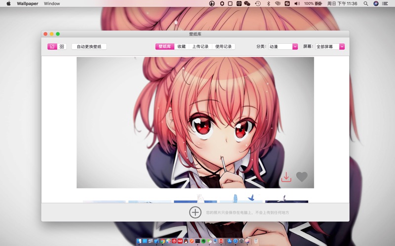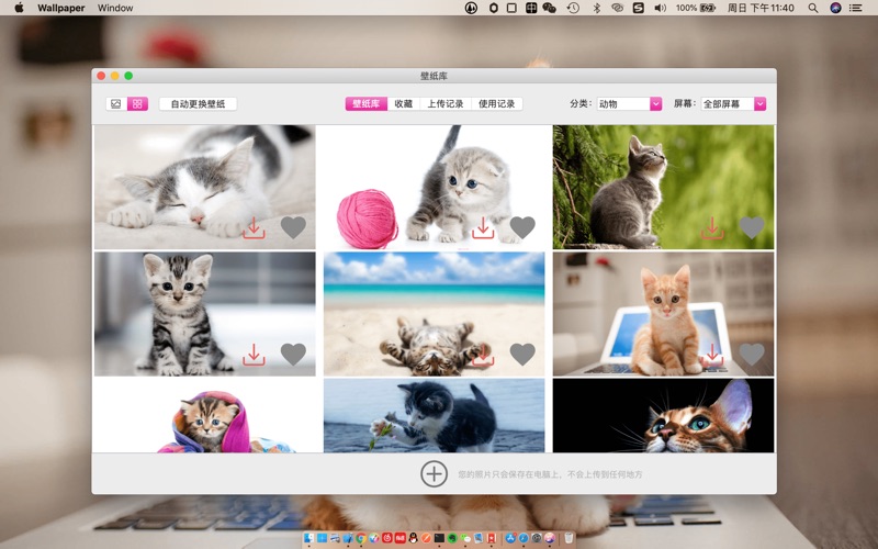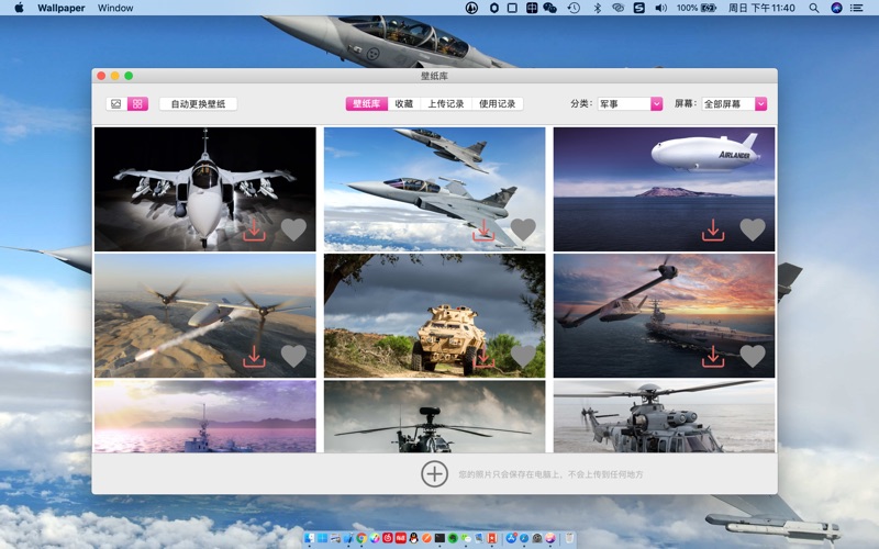 九大分类:风景、动漫、动物、太空、军事、汽车、食物、花、抽象 4K高清精美壁纸供您挑选 功能介绍: - 支持『大图』、『缩略图』两种方式浏览壁纸,让您更方便的找到心仪的壁纸 - 您可以将喜欢的壁纸进行「收藏」,方便以后的使用,您可以在「收藏列表」中对收藏的壁纸进行集中管理 - 您也可以从电脑中选择自己的图片来设置壁纸,我们支持「本地上传」功能。请您放心,您上传的的图片只会保存在电脑上,不会被发送到任何地方 - 对于上传的图片我们支持「裁剪」、「翻转」、「旋转」功能来编辑图片,同时您可以在「上传记录」中管理自己上传过的的图片 - 在「使用记录」中您可以看到所有使用过的壁纸 - 「自动更换」可以设置按照「更换源」、「时间」来自动更换壁纸,更换源中包含了收藏、上传记录、使用记录和所有的壁纸分类 - 选择的「更换源」可以同时作用于「随机换一张」功能 - 选择壁纸的时候我们支持按照「屏幕」来进行设置,方便在有多个屏幕时为每个屏幕来选择个性化的壁纸 - 「下载功能」,您可以将喜欢的壁纸下载到电脑中和好友分享,当然您也可以跟好友分享我们的App ^_^ 如果您在使用的过程中有任何的意见和建议,您可以App Store中进行留言评价,我们会对您的评论进行回复,如果您对App有一些自己的idea,我们欢迎您发送邮件给我们来帮助我们做到更好,如果您的idea被采纳,我们会将您添加到「支持列表」中,谢谢! 邮箱地址:feedback233@163.com - 性能优化 - 修复已知问题