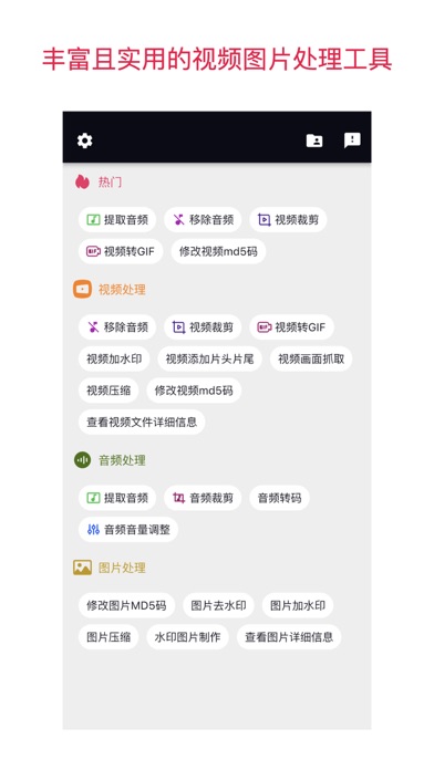 专为自媒体打造的专业视频处理软件。 包含很多实用的功能。 1.提取视频中的音频,可以批量提取。 2.移除视频中的音频,支持批量移除。 3.裁剪视频,截取视频中的一段或指定区域的画面。 4.视频转GIF, 支持标清和高清GIF。 5.修改视频文件的MD5码。 6.修改图片文件的MD5码。 7.查看视频文件的详细信息,包括视频中附带的元信息。 8.音频裁剪,截取音频文件中的某一段。 9.音频转码,调整音频文件大小,将音频文件格式转成其它格式。 10. 音频音量调整,调整音频文件的音量大小。 12. 查看图片详细信息。 13. 批量视频加水印,丰富的水印设置,灵活批量视频加水印更方便。 14. 批量视频添加片头片尾。 15. 图片批量加水印。 16. 图片批量压缩。 17. 视频画面抓取。 18. 视频压缩。 19. 水印图片制作。 20. GIF转mp4格式的视频。 21. 图片编辑,加标注,加马赛克,加文字。 22. 二维码图片制作。 23. 视频分割,精确分割,无需重编码,分割速度超快。 24. 视频格式转换,支持mp4, mov, mvk, flv, ts等格式的转换。 25. 视频转文字,识别并提取视频中的文字,速度快,精度高。 26. 视频拼接,支持多个视频文件拼接成一个视频,顺序任意调整。 27. 修改视频封面,支持任意封面图片。 28.视频画面拼贴,多种布局和比例任意选择。 29. 文字转语音和视频配音功能。 30.多图转视频功能。 31. 人声伴奏声分离功能。 32. 替换音频和添加音频。 33.视频变速。 34.视频尺寸调整。 35.视频旋转。 36.音频分割。 37.音频变速。 38.音频拼接。 39.音频转文字。 视频编码支持硬件加速,视频处理更快。 1.一些已知问题的修复。