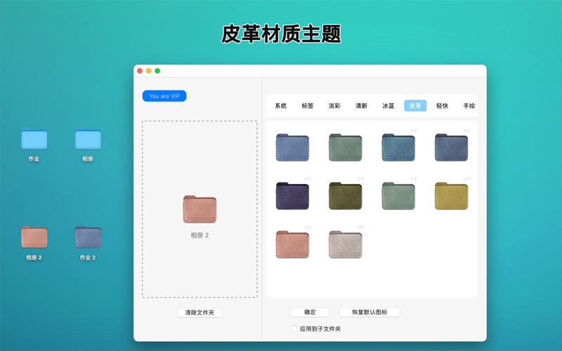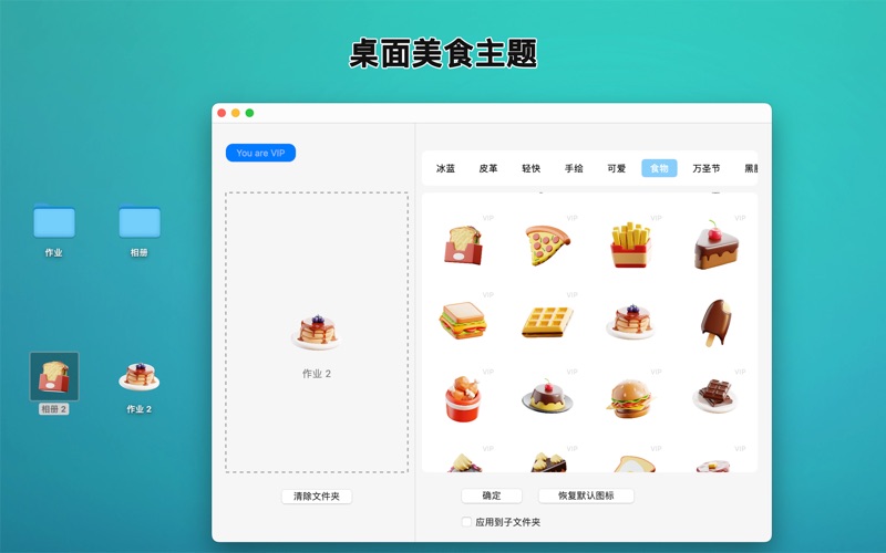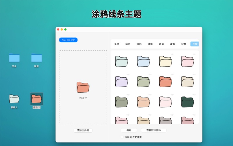 Folder Theme(百变文件夹)——让你的 Mac 文件夹前所未有地独一无二! 告别单调乏味的默认图标,用丰富多彩、个性化十足的主题为你的 Mac 桌面注入全新活力!Folder Theme 是一款强大的 macOS 应用,旨在帮助你轻松更换文件夹图标,让桌面既美观又井然有序,从而提升使用体验与工作效率。 焕新你的桌面: Folder Theme 提供多种风格的图标主题,无论是经典、时尚,还是创意十足的设计,总有一款能满足你的喜好!丰富的图标库涵盖以下主题: 彩色系统图标:为经典 macOS 图标增添鲜艳色彩,让桌面更加生动。 皮革纹理:高贵奢华的皮革质感图标,提升桌面档次感。 柔和粉彩:简约清新的色调,让人倍感舒适。 卡通图标:趣味十足的卡通设计,为你的创意增添灵感。 涂鸦风格:艺术感十足的手绘图标,独一无二。 美食主题:让人垂涎欲滴的美食图标,满足吃货的专属风格。 万圣节主题:应景又惊喜的节日图标,让节日气氛拉满。 黑胶唱片主题:复古音乐灵感,为桌面注入怀旧情怀。 冷调极简风:现代感十足的优雅蓝色图标,尽显高端品味。 核心功能亮点: 丰富的图标库:涵盖多种风格与主题,随心选择。 个性化定制:轻松为任意文件夹分配专属图标,快速找到所需文件。 提升桌面美感:让你的工作空间更加赏心悦目,打造专属于你的独特桌面。 简易操作:用户界面直观,图标更换轻松无忧。 多场景应用:适合整理工作文件、管理个人项目或分类兴趣收藏。 谁适合使用 Folder Theme? 效率控用户:通过直观的文件夹图标,快速定位和访问文件,提升工作效率。 桌面美化爱好者:打造符合个人品味的专属 Mac 桌面。 学生与创意工作者:用独特的图标激发灵感,让学习与创作更有趣味性。 现在就下载 Folder Theme(百变文件夹),开启 Mac 文件夹的美化新体验!告别千篇一律的图标,让你的桌面焕发新的活力与个性。无论是工作还是娱乐,Folder Theme 都能助你轻松打造整洁、有趣又与众不同的电脑桌面!百变文件夹 - 让您的文件夹更有个性! 百变文件夹 (Folder Theme) 是一款专为 macOS 设计的文件夹图标美化工具,让您的电脑桌面焕然一新!告别单调的系统图标,用丰富多样的主题图标打造独一无二的桌面风格,让文件查找更方便,让桌面更有品位。 功能亮点 多样化图标库:内置海量图标,涵盖各种风格和主题: 系统风格图标:不同色彩的经典 macOS 图标。 皮革纹理:高端质感的皮革风图标,尽显高级感。 清淡色彩:极简风格,淡雅又实用。 卡通风格:萌趣十足的可爱卡通图标,激发创意。 涂鸦风格:充满艺术感的手绘风图标。 美食主题:让人垂涎欲滴的食物图标。 万圣节主题:应景的节日图标,增添节日氛围。 黑胶唱片主题:复古音乐风格,让您的桌面与众不同。 冷淡风蓝色系:宁静优雅的冷淡风配色,提升桌面格调。 个性化定制:轻松为文件夹更换图标,让分类和查找变得更加高效。 提升桌面美观:随心搭配图标,打造专属于您的桌面风格。 便捷操作:简单易用的界面,轻松几步即可完成图标更换。 丰富场景适配:无论是工作文件夹、私人资料还是兴趣分类,都能找到适合的图标。 适用人群 效率达人:通过不同图标更直观地管理和分类文件。 桌面美化爱好者:用多样风格打造赏心悦目的桌面。 学生和创作者:用创意图标激发学习和工作的灵感。 现在就下载 百变文件夹 (Folder Theme),体验前所未有的桌面美化乐趣,告别单调,尽情释放个性!