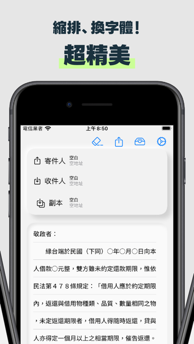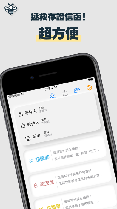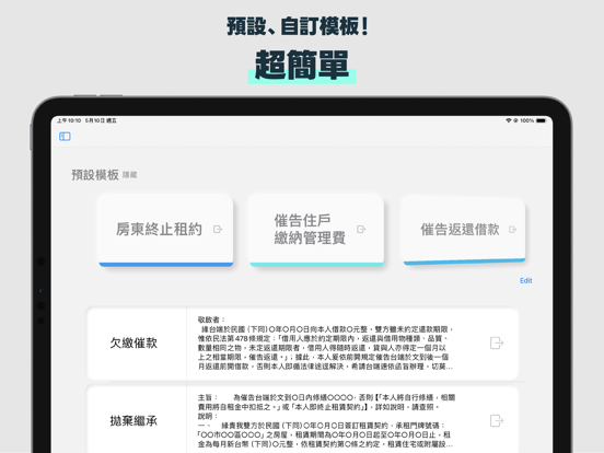 Beedea是一款方便的存證信函套寫APP,專為解決在WORD上套寫存證信函帶來的麻煩而設計。 功能特色: • 簡單套寫:透過Beedea提供的直觀介面,輕鬆完成存證信函的套寫。 • 精美排版:針對多層次清單的縮排對齊提供了優良的解決方案,製作出精美的存證信函外觀。 • 模版儲存:若您有反覆使用相同類型的存證信函,可以將其存成個人模版,方便下次修改使用。 • 預設模版:Beedea還提供了幾個簡單的存證信函模版供您參考。 使用iPhone,只需動動手指即可套寫存證信函,就像閒暇時和朋友聊天一樣輕鬆愉快。 - 支援深色模式了! - 調整UI細節,畫面更漂亮了。 - IAP框架更新,使用更穩定! - 其他bug修正