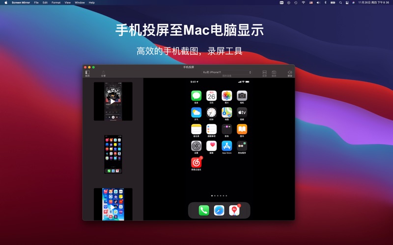 一键截图, 一键录屏 --- 最简单最好用的投屏程序 通过这个程序您可以非常方便地在电脑端给手机截图,或者录屏,并与您的朋友一起分享这些有趣的图片。同时还可以在电脑端同步观看或者收听您手机上播放的音乐,或者视频。 该程序主要包含以下三个功能: 1. 手机屏幕录像:简单,快速,所见即所得 2. 手机屏幕截图:一键截图,如你所愿 3. 手机镜像(投屏): 尽情享受大屏 注意: 该程序需要数据线连接手机哦,好多同学都以为是无线连接,千万别搞错啦。 兼容最新发布的macOS