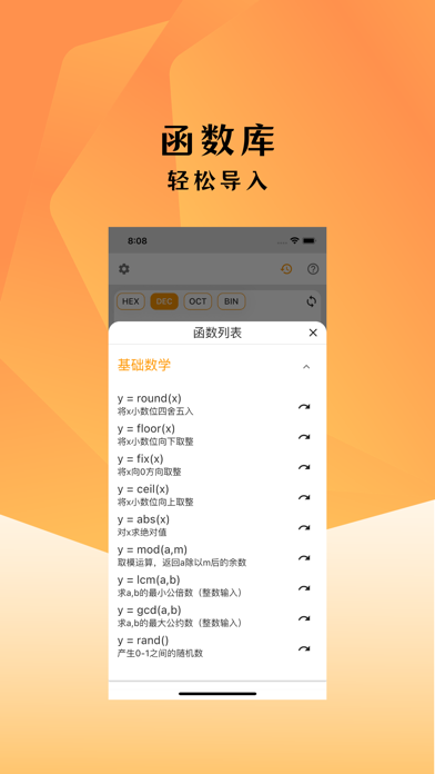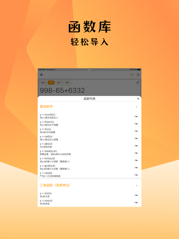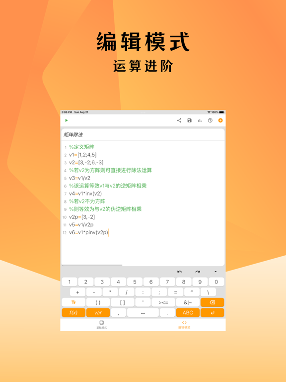 编程计算器提供基础模式和编辑模式两种操作方式,内置基础运算函数,语法解析器,支持多种应用场景。 微信搜索“数音匠”(SymbolicMath)关注公众号获取更多信息。 【基础计算】 基础模式提供基础计算器功能,满足日常计算应用。 【数学函数】 内置丰富数学函数,便捷实现基本计算。 【变量存储】 提供变量存储功能,在基础模式可存储中间计算结果,应用时一键导入导出,编辑模式提供变量浏览功能,轻松掌握计算结果。 【进制转换】 支持二进制、八进制、十进制、十六进制转换,满足不同平台计算需求。 【代码示例】 内置代码编写示例,轻松学习计算方法,扩展应用场景。 【代码分享】 可通过二维码或文件方式分享代码,同时应用也支持直接读取文件,或扫描二维码,可通过电脑编写,手机运行方式进行应用。 1.稳定性提升