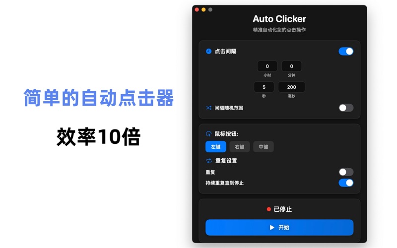 一款专为macOS设计的精准自动点击工具,让您轻松实现鼠标操作的自动化。支持自定义点击间隔、随机时间范围、多种鼠标按键选择,以及灵活的重复设置。内置快捷键控制,让您随时启动或停止操作。无论是游戏、测试还是日常办公,Auto Clicker都能为您提供高效、可靠的自动化解决方案。 免费版限制: • 每次使用限制最多10次点击 • 每次使用时间限制为3分钟 • 仅支持鼠标左键点击 Premium会员解锁: • 无限点击次数 • 无限使用时间 • 支持鼠标左键、右键、中键点击 • 高级自动化功能 注:部分功能需要升级到Premium会员才能使用。 本应用使用苹果标准服务条款 (EULA) https://www.apple.com/legal/internet-services/itunes/dev/stdeula/