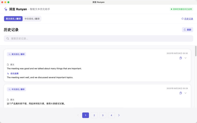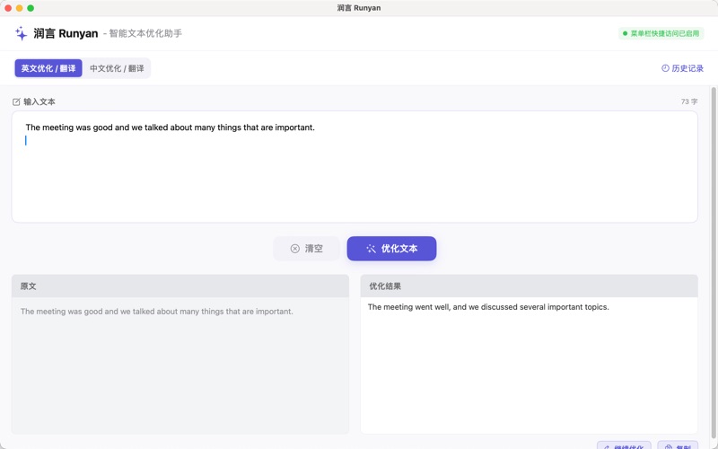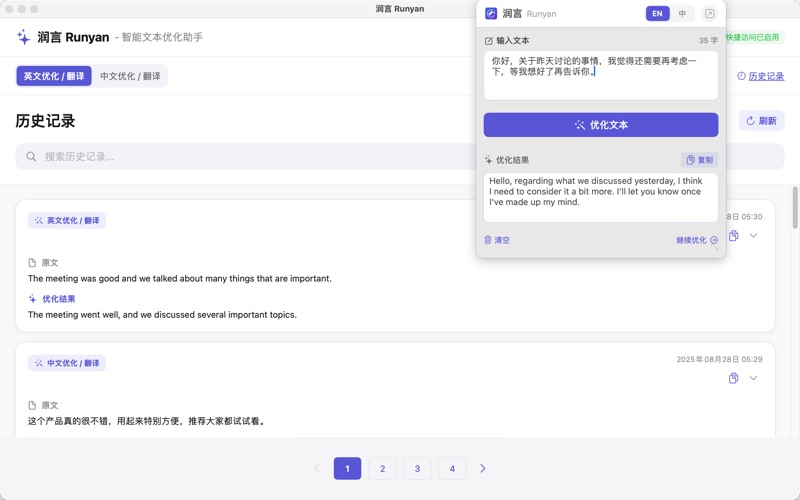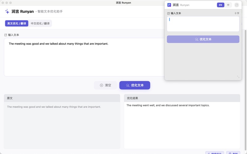 润言 Runyan - AI驱动的智能文本优化工具,让您的文字更加精准、流畅、专业。 【核心功能】 智能润色 基于先进的AI模型,自动优化文本表达,让文字更加流畅自然。无论是商务邮件、学术论文还是日常写作,都能帮您提升文本质量。 中英互译 专业级的中英文互译功能,保持原文风格和语境,确保译文准确地道。支持快速切换语言模式,满足不同场景需求。 迭代优化 支持基于反馈的迭代优化,根据您的需求不断改进文本,直至满意为止。每次优化都会保存历史记录,方便对比选择。 【产品特色】 原生体验 为macOS精心设计的原生应用,完美融入系统。支持菜单栏快速访问,随时随地优化您的文本。 悬浮窗口 便捷的悬浮窗口模式,小巧精致,始终置顶。不打断您的工作流程,随时调用,即用即走。 快速响应 优化的API架构,确保快速响应。采用先进的AI技术,让您的创作过程流畅不中断。 【使用场景】 商务写作 让您的商务邮件、报告、提案更专业得体,准确传达商业意图,提升职场形象。 学术研究 优化学术论文、研究报告的语言表达,让您的学术成果更加严谨、清晰。 创意内容 为自媒体创作者、内容运营者提供文案优化,让每一篇内容都更吸引人。 日常沟通 帮助您在社交媒体、即时通讯中更好地表达想法,让沟通更加高效。 【界面设计】 主窗口模式 完整的编辑界面,适合长文本处理。支持实时预览优化结果,操作直观便捷。 快捷键支持 Enter键快速提交,Shift+Enter换行,符合您的使用习惯,提升操作效率。 实时反馈 实时显示字数统计,优化进度可视化,让您掌控每一个细节。 【为什么选择润言】 深度本地化 深入理解中文语境和表达习惯,优化结果更贴合中文用户需求。同时精通英文优化,双语能力出色。 安全可靠 您的文本数据通过安全通道传输,严格保护隐私。我们不会存储或使用您的数据进行其他用途。 持续进化 基于用户反馈不断改进算法,定期更新优化模型,确保您始终享受最佳的文本优化体验。 专业团队 由经验丰富的AI工程师和语言专家共同打造,致力于为您提供最专业的文本优化服务。 润言 Runyan - 让每一个字都恰到好处。立即下载,开启您的高效写作之旅!
