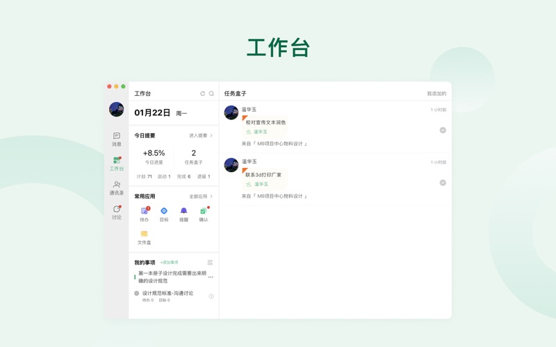 进展是一款团队协作工具,安排任务、设置日程,让事情的进展一目了然。 1、随时随地跟进事情的进展 创建一个事项,即可随时随地跟进事情的进展,事事尽在把握。 2、轻松有效的团队协作方式 以个体为中心,让你真正找到自己享受的工作状态,获得前所未有的成就感。 3、构建组织运转的良性驱动系统 还原社会关系运转的内在逻辑,清晰呈现人在组织关系中的位置和节点,重塑组织中个体的驱动力体系。 4、提升效率,降低成本,创新业务 通过组织形态创新优化资源配置效率,并从根本上驱动业务创新。经过大数据分析,通过应用「进展」,可优化50%以上的组织运转成本。 5、可靠,安全,永久保存 QQ可保存30天,微信无法进行保存。「进展」上生成的所有内容都基于云端保存。网银级加密,可靠、安全,永不丢失。 6、轻松上手 无需部署,注册即可使用。同时基于用户已经养成的移动操作习惯打造,足够易用,即刻就能上手。 - 修复已知问题