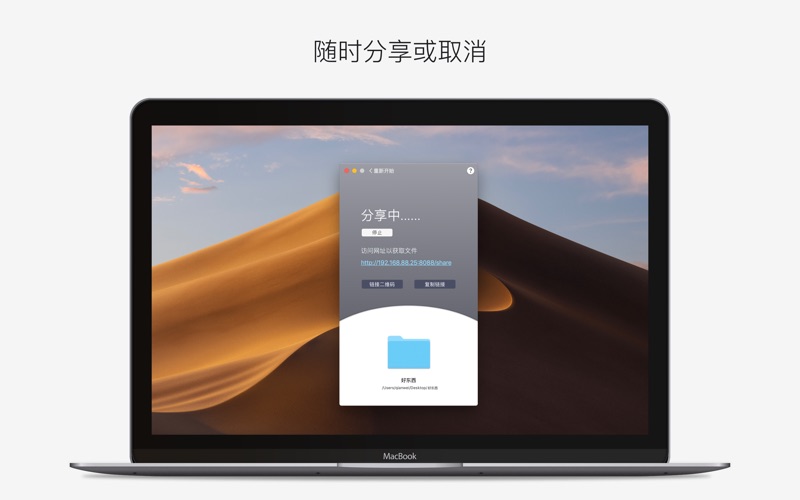 极速分享:简单,快速,轻便,方便的文件共享 只需选择或拖拽文件夹,极速分享 将启动 HTTP 文件服务器(HFS)。 其他人便可以访问和下载文件。 ▶ 特点 • 传输任何文件类型而不更改原件 • 无需安装任何应用程序即可获取共享文件 • 将文件共享到其他计算机,手机和平板电脑 • 支持多个平台 ▶ 何时使用 极速分享 • 任何时候您想要立即发送文件 • 当其他人不想安装任何应用程序来获取文件时 • 在向其他手机迁移照片,视频和音乐时 • 当您需要在朋友/同事之间发送大文件时 • 如果您想在开溜前轻松将大文件传输到其他人的手机上 更好的体验