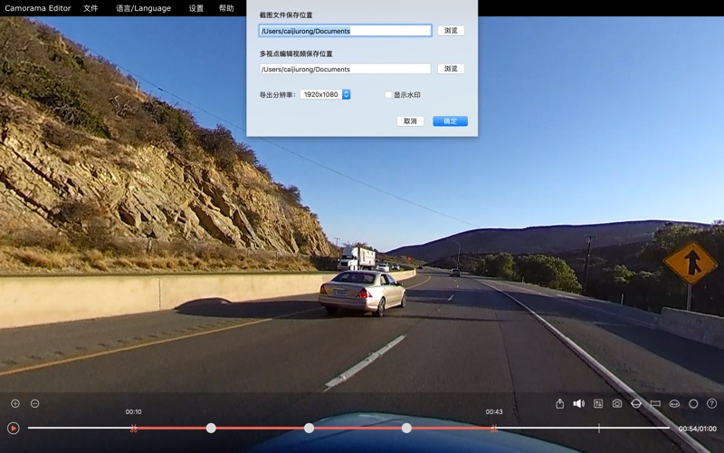 Mac编辑器功能: 1.多视角编辑,支持3840x2160、1920x1080、1280x720的分辨率视频导出,可以选择添加定制水印 2.支持2:1视频裁减导出,分辨率包括标清(1280x640),高清(1920x960),2K(2560x1280),4K(3840x1920) 3.预览图片和视频,支持各种模型之间的切换等 1.增加批量导出视频的功能 2.画中画下增加二分画面模版
