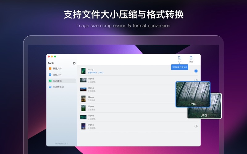 解压大师是一款专注于文档解压、文档压缩、图片压缩、图片转格式的mac工具! - 支持几十种文件格式预览 - 支持图片压缩,可批量压缩图片 - 支持图片格式转换,支持png、jpg等 修复bug,优化解压速度