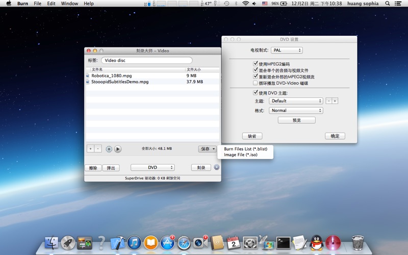 刻录大师是一款优秀的刻录软件。支持数据(HFS+, ISO9660,Joliet,UDF,HFS), CD(Audio CD, Mp3 Audio, Dvd Audio), VCD,SVCD,DVD,Divx, HD视频等各种格式的碟片刻录, 快速且易使用;能将文件列表保存为loxi、cue、iso等映像文件,且能刻录这些映像文件;内嵌万能的音频、视频格式转换器, 能将各种不同编码的音视频文件转化为指定的音视频格式进行刻录;内嵌音视频播放器能播放各种格式的音视频文件。 * 多样化的设置 1> 可选择刻录驱动器(如果有多个刻录设备)。 2 > 可选择可刻录的碟片,CD碟片可选择: 小片 (8 厘米)---158 MB (18 分钟),185 MB (21 分钟); 普通(12厘米)--- 540 MB (63 分钟),640 MB (74 分钟),700 MB (80 分钟),800 MB (90 分钟),900 MB (99 分钟)。DVD碟片可选择:小片 (8 厘米)---DVD R(W) (1.4 GB),DVD R(W) DL (2.8 GB); 普通(12厘米)---DVD R(W) (4.8 GB),DVD R(W) DL (9.4 GB)。 3> 可选择输出目录,是否快速擦除或者格式化擦除碟片,是否验证已烧录的数据等等。 * 数据刻录 刻录大师可轻松拖放任何数据文件到指定列表,可创建列表目录,可拖动文件到任意指定列表目录和位置,从而改变文件刻录顺序。 * 音乐刻录 刻录大师支持三种音乐CD刻录方式: Audio CD刻录----先用内嵌的音频转换器将各种音频格式转化为aiff格式, 然后进行刻录;Mp3 Audio刻录---支持艺术家或专辑目录分类, 先用内嵌的音频转换器将各种音频格式转化为Mp3格式,然后进行刻录; DVD Audio刻录----实际上刻录的是DVD的音频格式。支持的音频格式包括 MP3, WMA, WAV, Apple Lossless, M4A, M4R, CAF, MMF, AAC, AC3, AIFF, AMR, AU, FLAC, OGG, WV, APE等等。 * 视频刻录 刻录大师支持四种视频刻录方式:VCD、SVCD、 DVD和 Divx刻录。先用内嵌的视频转换器将各种视频格式转化为VCD、SVCD、 DVD和 Divx的标准格式,然后刻录。其中DVD还可设置主题和样式,Divx可设置视频的分辨率、比特率、帧率等参数。 支持的视频格式包括 OGG,WebM, WMV, MKV, AVI, DivX, Xvid, MP4, MOV, QT, VOB(输出),RM, RMVB, FLV, MPEG2, TS, ASF, 3GP, 3G2, GIF, SWF, H.264/MPEG4 AVC, H.264/PSP AVC Video, H.264 TS, HD, etc. * 支持映像文件 刻录大师能将文件列表保存为loxi、cue、iso映像文件, 并能刻录这些映像文件。 * 100% 纯软件 刻录大师是完全的绿色软件,本地运行无任何联网,无任何安装插件。 反馈: 如果您有好的意见或建议,请发送邮件: liuwason@gmail.com 或者459788263@qq.com 1. 能任意添加配音。 2. 能任意添加字幕。 3. 能任意添加章节。 4. 增加了缩放模式。 5. 修正了一些其它bugs。