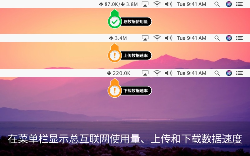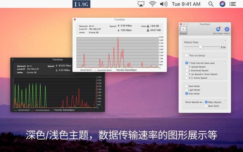 如果您有上述问题,那么您的PC应该有TransData App。 ■ TransData是控制和监督网络使用的完美解决方案。 ≈ 特征:≈ ◉ 在菜单栏上以上/下速度显示Kbps / Mbps的网络数据传输速率。 ◉ 显示Mac从会话开始使用的总数据。 ◉ 监控和重置Internet数据使用情况。 ◉ 在菜单中显示连接的WiFi网络。 ◉ 美丽的小部件或图形,显示每秒上传和下载的互联网速度。 ◉ 可以在首选项中设置显示刷新率。 ◉ Internet数据可以以KB / s(字节)或kb / s(位)两种格式显示。 ◉ 适用于所有macOS版本的暗/亮模式。 有足够的理由下载TransData,现在就开始吧!! 不要等到明天。 TransData适用于MacBook Air,MacBook Pro,iMac,MacBook,MacPro,Mac Mini。 ≈ 基础知识:≈ ◎ 上/下速度:上传/下载每秒互联网传输速率(Kbps / Mbps) ◎ 上/下数据:总上传和下载一段时间内使用的互联网日期。 ◎ Micro View:桌面上的浮动小部件,具有上/下互联网数据传输速率。 ◎ 宏观视图:详细显示互联网数据传输速率的图表。 ≈ 菜单栏偏好:≈ ◎ 使用的互联网数据总量:显示发送和接收的数据总数。 ◎ 上传速度:仅显示上传网速。 ◎ 下载速度:仅显示下载网速。 ◎ 上下速度:显示上传和下载速度。 ◎ 活动速度:显示上传或下载,以最高者为准。 我们很乐意回答您的问题,或者只是听听您对TransData的看法。在support@appyogi.com在线查找 隐私政策:https:/appyogi.com/legal/privacy ■■■感谢使用TransData■■■ 我们修复了崩溃、错误,并进行了改进,以提高您的应用体验。 如果你喜欢TransData,请在AppStore上给我们打分! 我们将永远感谢你。