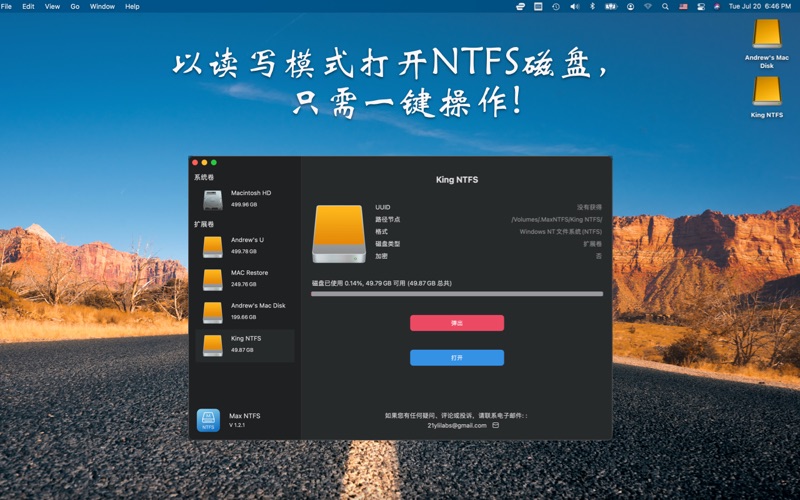 Max NTFS是一款可以读写方式打开NTFS格式磁盘的小工具。 我们可以非常有效地支持NTFS格式磁盘的读写。 启动应用程序,它会自动检测所有硬盘,在主界面一键操作即可开始读写NTFS格式的磁盘,无需执行繁琐的命令。 提醒: 使用完 NTFS 磁盘后,请勿直接拔下 USB 设备。 请单击应用程序中的弹出按钮以安全弹出。 否则,磁盘的状态可能会变脏(导致软件重新挂载NTFS无效),导致磁盘丢失数据。 1. 优化磁盘读写速度。 2. 修复已知问题。