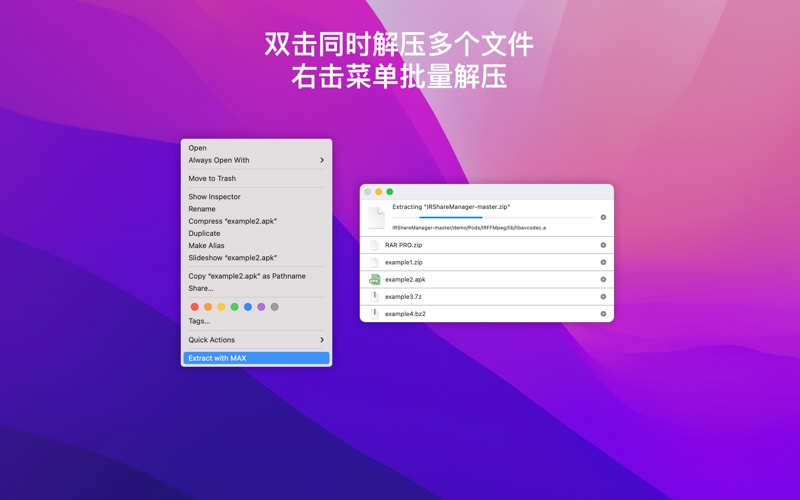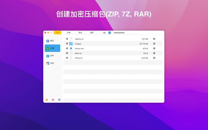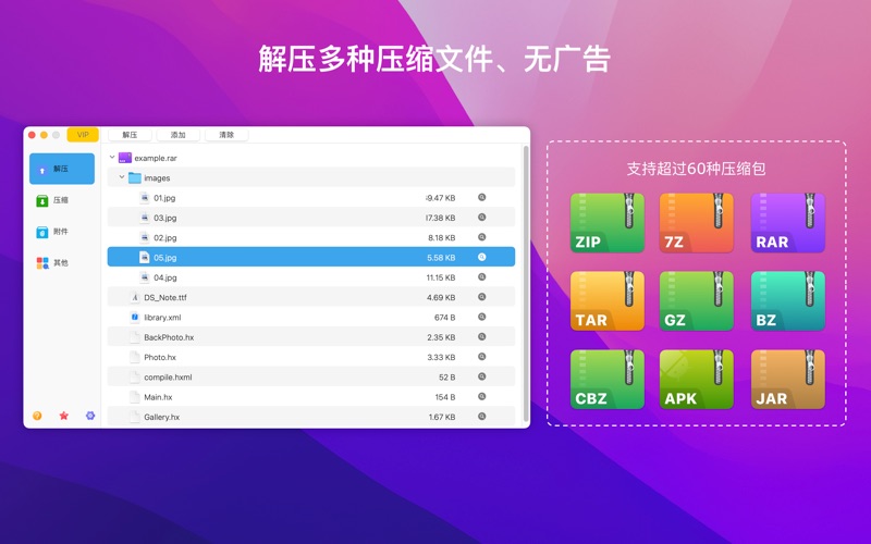 ● 支持7Z, ZIP, RAR, TAR, GZIP, BZIP2, GZ, XZ, LZIP, ACE, ISO, LZMA, CBR, EXE, MSI, LZH, CPIO, CAB, JAR, PAK, PKG, APK, ACE, ARJ, LQR, SPK, SWF, NSA, RPM, CPT等所有格式解压 ● 支持7Z, RAR, ZIP等加密压缩文件的创建 ● 支持从pdf文档中提取图片 「功 能」 ● 所有格式压缩文件解压 ● winmail.dat附件预览及解压 ● 双击预览压缩包(类似WinRAR) ● 双击解压 ● 压缩包中任选文件解压 ● 解压到当前目录 ● 加密文件压缩 ● 拖拽压缩包中文件直接解压 ● 批量解压 ● 支持多种可视窗口 「邮箱」 ● zhiminl@qq.com 「使用条款」 ● https://www.apple.com/legal/internet-services/itunes/dev/stdeula/ 「隐私政策」 ● https://dami0209.github.io/privacy.html Fix some bugs