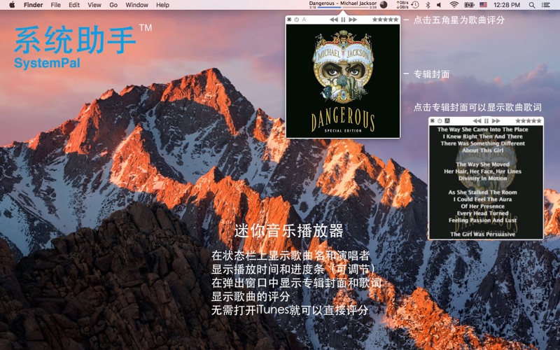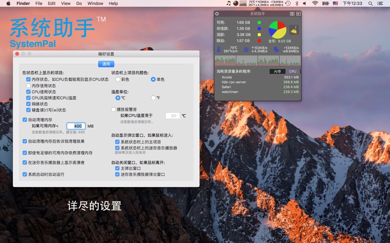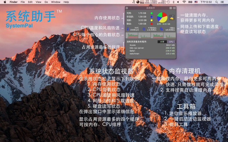 在系统状态栏上显示内存和CPU的使用状态,显示CPU温度和风扇转速,显示网络上传和下载速度,硬盘读写状态。系统助手(SystemPal)正在进化为一个All-In-1全能工具。提供一个工具箱,包括迷你音乐播放器,截屏工具,内存清理机。 优良特性: 1. 直接在状态栏上显示系统状态。非常方便随时查看系统状态。 2. 提供一个显示于状态栏上的迷你音乐播放器。 此播放器能够控制iTunes,播放音乐库中的歌曲,您可以很方便地在状态栏上查看正在播放的歌曲的曲名和表演者。您还可以随时查看专辑封面、歌词,并且给歌曲评分。当您关闭iTunes时,迷你音乐播放器会自动缩小为一个小图标,节省状态栏上的空间。 3. 提供一个截屏工具。您可以截取鼠标所选区域,截取单个窗口,截取整个屏幕。您还可以选择保存到桌面或保存到剪贴板。更实用的是,您可以选择等待3秒后再启动截屏。 4. 支持快速启动Mac系统自带的活动监视器。 5. 用饼图显示内存使用状态。 6. 显示CPU使用状态图。支持多核处理器。 7. 显示网络上传和下载速度。 8. 显示硬盘读写状态。 9. 可按需选择在状态栏上显示的信息。 10. 一键清理内存。当你觉得可用内存不够时,可以点击“清理内存”按钮。仅需要数秒就能完成清理。 11. 自动清理内存。可以设置当可用内存低于某个值时自动清理内存。 12. 显示系统中消耗内存或CPU最多的程序。可以直接关闭某消耗资源较多的程序。(新功能!) 13. 支持高温报警!(默认关闭) 13. 针对OS X优化。完美运行于全屏应用模式和所有Space。 14. 支持开机自动运行(需要在偏好中设置一下)。 15. 系统助手(SystemPal)仅消耗极低的系统资源,远远低于相似功能的其他程序。 此款小工具是以下人士必备: - 网络冲浪者 - 电影工作者 - 图形创作家 - 建筑设计师 - 软件开发工程师 - 音乐创作家 - 摄影家 - 科学家 - 虚拟机使用者 - 游戏爱好者 说明: - 如果您发现此软件存在任何问题,请您及时报告给我们,并且提供计算机的型号(如 MacBook Pro 13英寸 2010年版)。我们将尽快解决此问题。谢谢! - 欢迎告诉我们您的意见和建议,我们会继续努力增加功能。 联系邮件:support+macsystempal@pop-hub.com 更新历史: 2015-02-03 5.1 解决了界面上的一些小问题。 2015-01-12 5.0 增加了显示占用网络资源最多程序的功能,专为Mac OS X 10.10 Yosemite修复与改进了显示效果,以及多项改进。 2014-04-01 4.1 修复软件缺陷. 2014-01-23 4.0 增加硬盘读写状态,加快清理内存的速度。 2012-07-21 3.2 修复了在2012年中Macbook Air/Pro/Retina机型上出现的不显示温度的问题。 2012-01-12 3.0 增加了一个在状态栏上显示的迷你音乐播放器。增加了一个截屏工具。增加了活动监视器的快速启动按钮。 2011-12-20 2.3 修复软件缺陷. 2011-12-14 2.2 支持网络上传和下载速度。 支持自动清理内存。 2011-09-27 2.1 支持CPU温度和风扇转速。 2011-09-20 2.0 支持CPU负载状态。重命名为系统助手(SystemPal)。 2011-08-11 1.0 内存清理机(MemoryTool),在状态栏上显示内存状态饼图,清理内存。 1. 解决了界面显示的问题,支持macOS Sierra。 2. 支持macOS黑夜模式(Dark Mode)! 3. 移除了mini music player过时的背景。 4. 解决了其他小问题。 5. “联系开发者”邮件会包含诊断信息(绝不包含任何个人信息),这有助于我们解决各种疑难杂症。如果您不想把这些信息共享给我们,可以把它删除。 6. 因为“消耗网络资源最多的程序”这个功能在macOS Sierra不能正常工作,我们移除了这个功能。