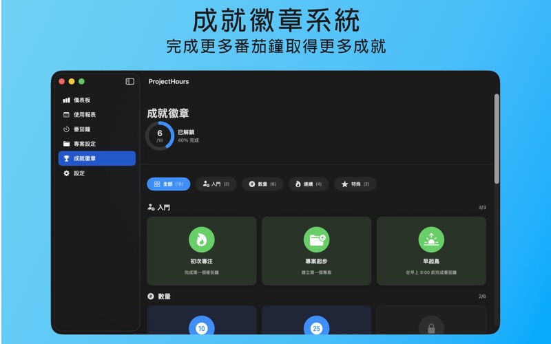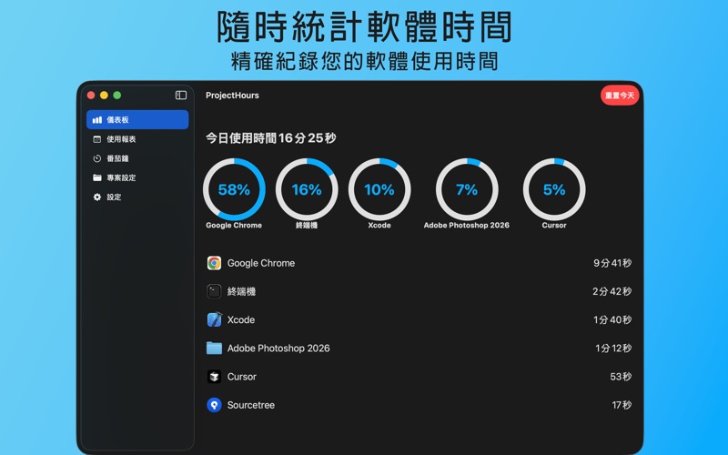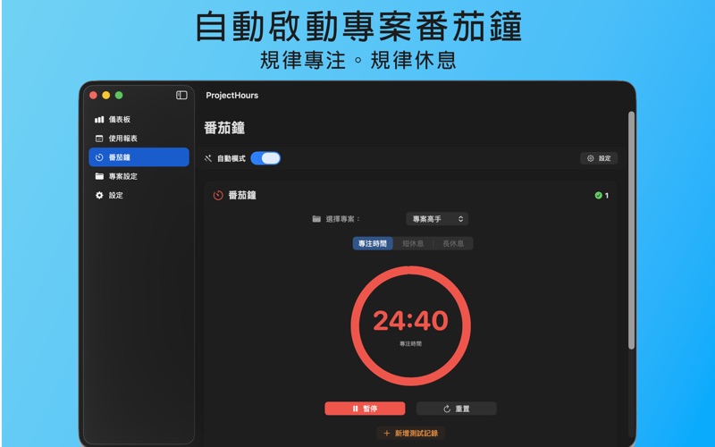 ProjectHours 是一款方便實用的 macOS 軟體,幫助您輕鬆記錄每天在 Mac 上使用各種應用程式的時間。它能精確統計您在不同應用程式中的使用時長,並以清晰的圖表呈現,讓您更有效率地了解與管理自己的電腦使用習慣。 在 ProjectHours 的主畫面中,您可以即時查看每個應用程式的使用比例、每日使用時段分佈,以及其他有用的分析數據,讓時間管理變得簡單又直覺。 新版本特色 新版 ProjectHours 加入了 「專案指定」與「自動番茄鐘」 功能! 現在您可以將應用程式的使用時間歸屬到不同的專案,讓工作與生活的時間分配更加清晰。同時,當您啟動指定專案時,番茄鐘會自動開始計時,幫助您專注於當前任務,不再忘記啟動計時器。 主要功能 自動記錄 Mac 上所有應用程式的使用時間 清楚顯示每個應用程式的使用比例與統計 支援每日使用時段分佈視覺化 新增專案管理功能,分類統計更明確 自動啟動番茄鐘,提升專注效率 簡潔直觀的使用介面 如果您想更有效率地管理工作與休閒時間,ProjectHours 絕對是您不可或缺的工具。 立即下載 ProjectHours,開始追蹤、分析並優化您的 Mac 使用時間,讓每一天的專注力發揮最大效益。 您可以設定專案名稱,且新增了自動啟動番茄鐘功能