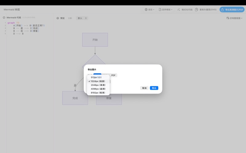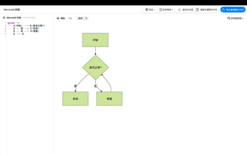 Mermaid 转图是一款 macOS 专用工具,帮你把 Mermaid 文本快速转换为可视化图表,并导出为图片或矢量文件。 【主要功能】 • 实时预览 左侧编辑 Mermaid 代码,右侧即时渲染。支持流程图、时序图、甘特图、类图、状态图、饼图等主流图表类型。 • 多格式导出 - PNG:适用于演示、文档、网页 - SVG:矢量格式,可无损缩放 - PDF:便于打印和分享 • 多种主题 内置默认、森林、深色、中性、基础等多种主题,可快速切换图表风格。 • 语义化配色 为开始、结束、决策、处理等节点设置不同颜色,让流程图更易读。提供主题编辑器和颜色使用指南。 • 代码编辑体验 - 语法高亮 - 行号显示 - 代码格式化 - 内置常用模板 • 甘特图时间轴 支持日、周、月、季度视图,适合项目排期和进度展示。 • 文件管理 支持 .mmd、.mermaid 及纯文本文件的打开与保存,草稿自动保存。 【免费功能】 标准导出(最大宽度 1024px)、全部主题、语义主题、代码编辑、文件管理等均可免费使用。 【内购项目】 高清导出:解锁 PNG 导出最大宽度 2048px,适合大屏展示和高清文档。 适用于产品经理、开发、设计师、技术文档编写者,以及需要快速绘制流程图、时序图等图表的用户。
