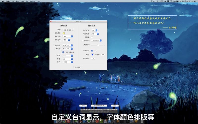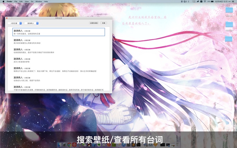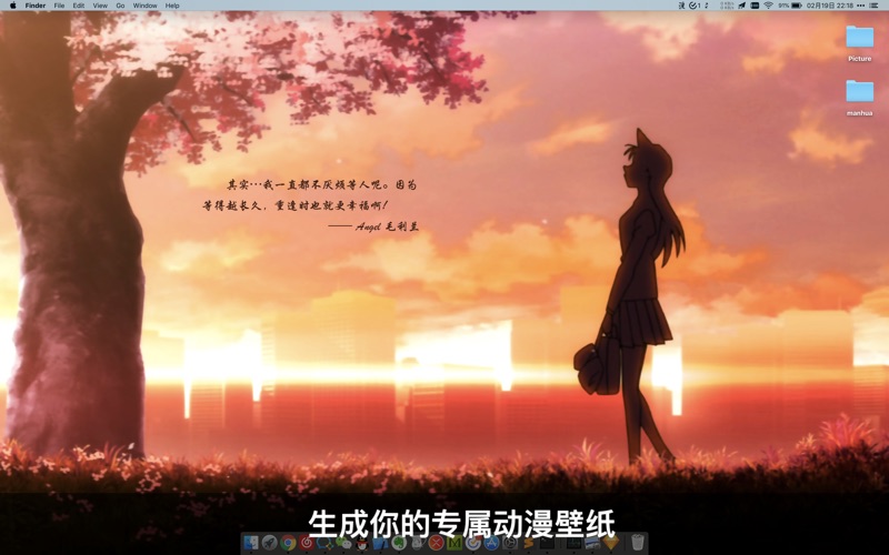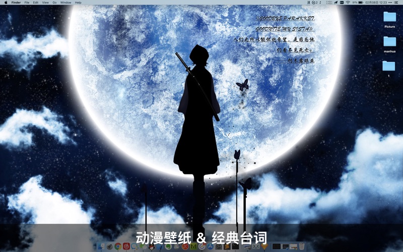 欢迎来到漫の话。每一张壁纸都精心挑选,海贼/火影/死神/柯南等等,让你的桌面美到爆炸、炫酷到没朋友;每一句经典台词都保留着动漫味道,一看到便会想起曾感动过你的情节台词。 『精选壁纸』 - 上千张高清壁纸,你喜欢的动漫都可以搜索到。 『经典台词』 - 上千句经典台词,搭配精美动漫壁纸,效果爆炸。 - 自定义台词的显示,字体颜色,大小,在桌面位置,简繁切换。 『休息提醒』 - 连续使用电脑1小时,提醒休息3分钟(使用/休息时间均可设置)。 - 科学工作和休息,避免眼部疲劳。 『自动切换』 - 可设置时间,自动更换,桌面不单调。 『自定义设置』 - 自定义背景图片。 - 复制台词内容。 - 收藏壁纸/诗歌,历史记录。 - 截屏,保存壁纸。 适配新系统,增加动漫台词和壁纸。