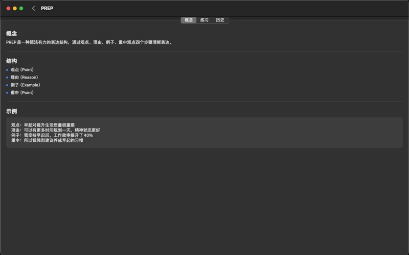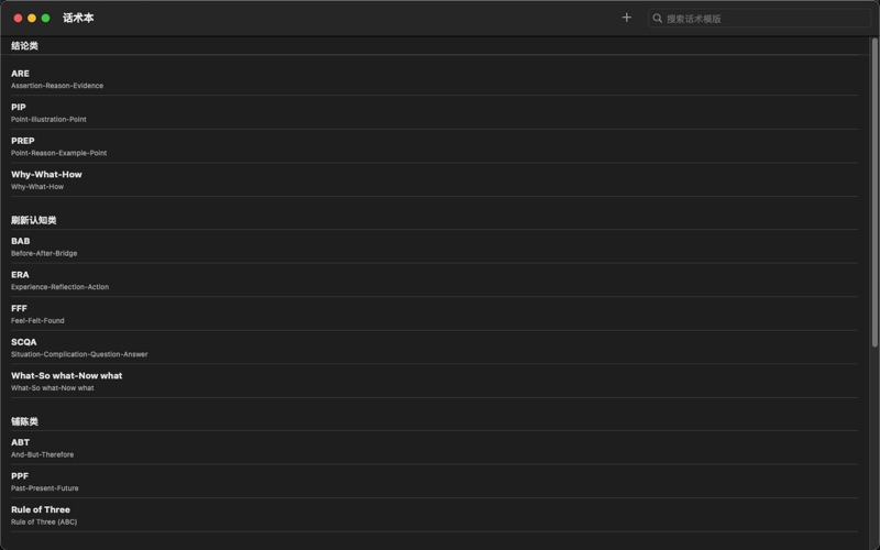 话术本收录了常用的沟通与表达模板(如 SCQA、AIDA、PAS、STAR 等),帮助你在汇报、反馈、表达观点、解释问题等场景中快速整理思路,形成清晰、有效的表达结构。 通过简洁的填空式练习,你可以根据模板提示填写关键要点,并自动生成属于自己的表达草稿。同时,你可以保存练习内容,随时查看与复盘,不断提升自己的表达能力。 主要功能: - 查看常见表达结构与使用说明 - 示例帮助你快速理解每种模板的使用方法 - 填空式练习:根据提示整理自己的表达内容 - 自动生成完整表达稿,便于复制与使用 - 本地保存练习记录,随时查看,无需网络 - 界面简洁,专注表达训练 话术本不依赖任何后台服务,不收集或上传用户数据。所有内容均保存在您的设备本地,安全、轻量、无负担。 适用场景: - 工作沟通与汇报 - 表达需求、反馈建议 - 解释问题、澄清误会 - 演示、发言前的思路整理 - 日常沟通训练 无论是想提升表达逻辑,还是需要一个随身的小工具帮助你快速组织语言,话术本都能成为你的得力助手。