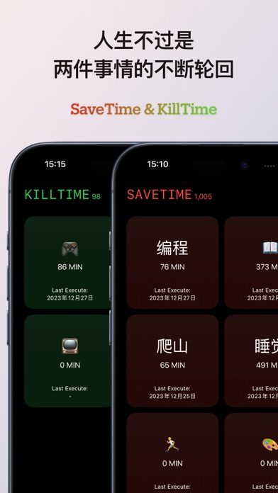 这是一个简单的记录时间小工具,跟其他效率及专注类App不同。它强制把时间记录分为两个大类:SaveTime & KillTime。 您可以根据自己的经验与体悟,把任意事项分配在这两个类别中。 最终 SaveTime 减去 KillTIme 就是您的“时间存款”余额,请小心呵护您的“钱包”哦。 关于隐私: 我们不采集您的任何数据,若你要使用iCloud备份数据,则需要授予本App访问网络的权限,包括本App作者在内的任何人都无法读取您备份在iCloud中的数据,您的数据只属于您。当然你可以随时关闭本应用的网络权限,这并不影响它的任何功能。 * 修正灵动岛被占用过多区域的问题