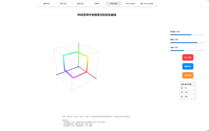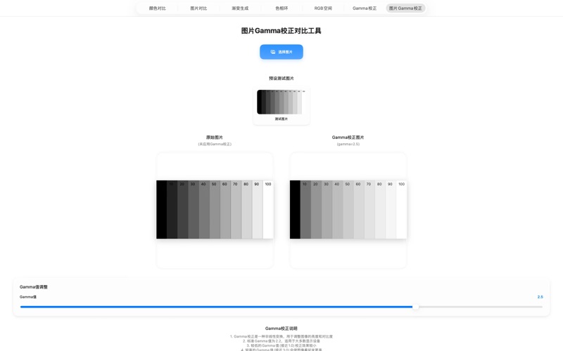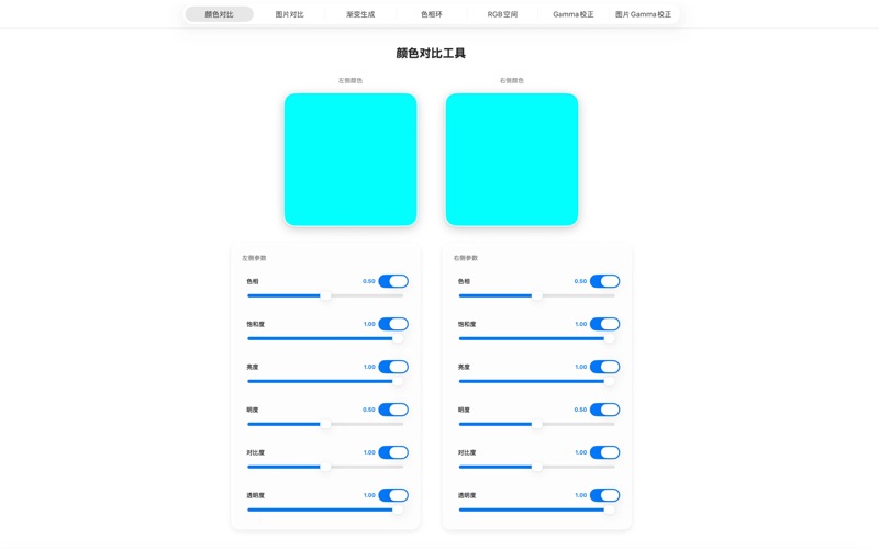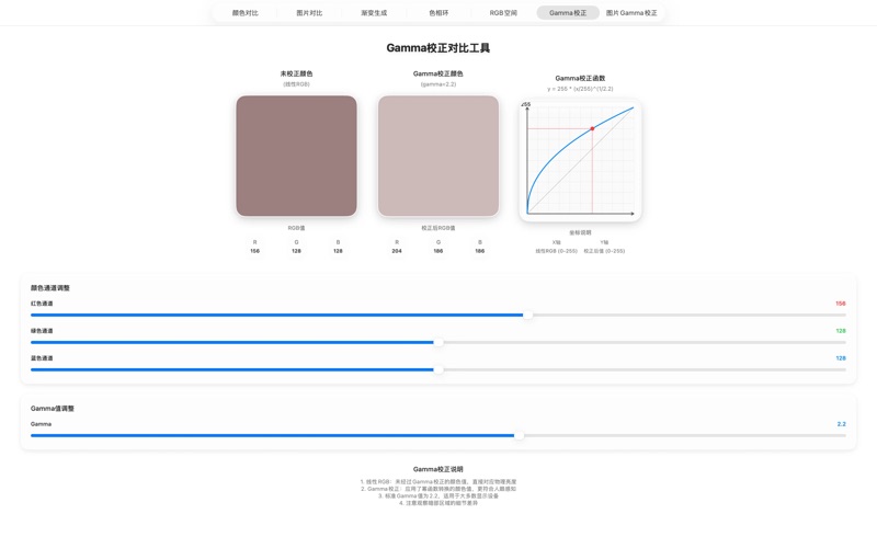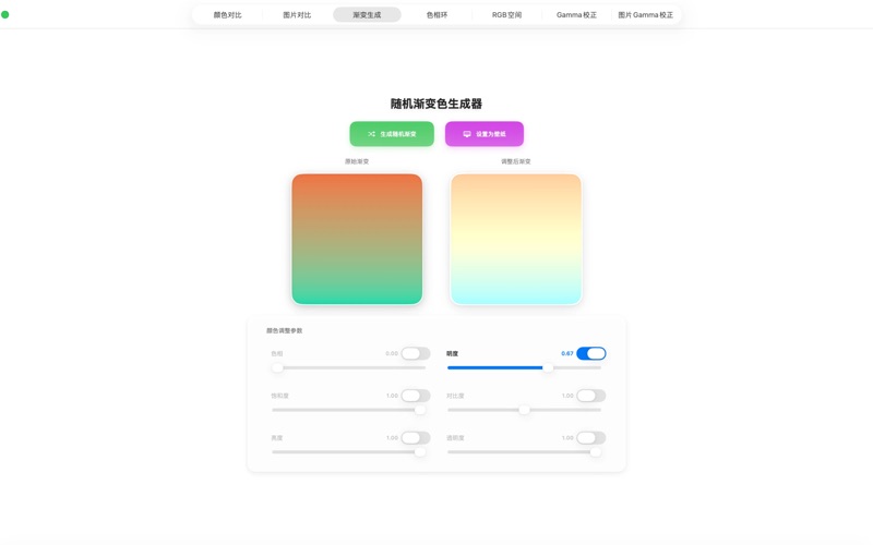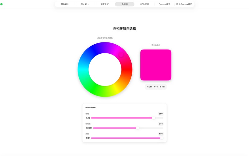 色彩同步App是一款功能强大的色彩管理工具,为设计师、开发者和色彩爱好者提供全方位的色彩分析与处理功能: 主要功能: 1. **颜色对比** - 左右分栏实时对比不同颜色参数效果,精确分析色彩差异 2. **图片对比** - 上传图片并应用各种色彩调整,实时对比原始与调整后效果 3. **渐变生成** - 随机生成美观的渐变色方案,支持一键设置为桌面壁纸 4. **色相环** - 通过交互式色相环直观选择颜色,支持精确的色彩参数调整 5. **RGB空间** - 在3D空间中可视化色相变化的闭合曲线,展示色彩理论原理 6. **Gamma校正** - 展示Gamma校正对颜色的影响,帮助理解色彩感知原理 7. **图片Gamma校正** - 对图片应用Gamma校正,对比校正前后的效果 技术特点: - 现代化SwiftUI界面,流畅的动画效果 - 高性能图像处理,支持实时预览 - 精确的色彩计算算法,符合人眼感知 - 3D可视化技术,直观展示色彩空间 - 与macOS系统深度集成,支持系统级功能 应用场景: - UI/UX设计中的色彩方案制定 - 摄影后期处理与色彩调整 - 色彩理论学习与教学 - 前端开发中的色彩代码生成 - 品牌色彩方案设计与管理