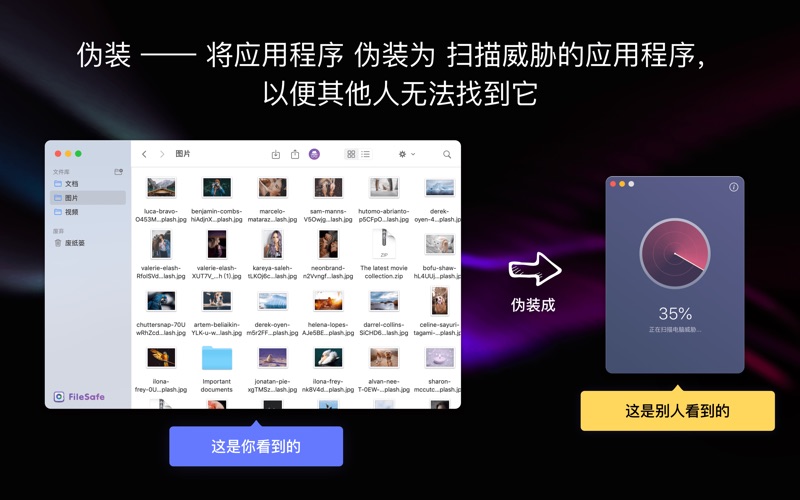 FileSafe为您的私人文件提供了一个秘密的保险箱。 它保护您的个人照片、视频或其他文件不被他人可见。 将文件导入FileSafe后,您电脑的其他使用者将无法浏览或搜索它们,而您依然可以通过本应用将其打开。 我们还提供了伪装功能,使其他人即使启动FileSafe也不会察觉到您的秘密。 使用FileSafe保护您的隐私并避免尴尬! 如果您有任何问题或建议,请随时与我们联系。 - 邮件: filesafe@thinkyeah.com 修复了一些错误和崩溃问题