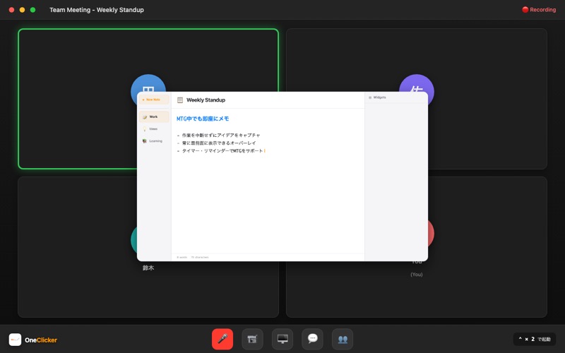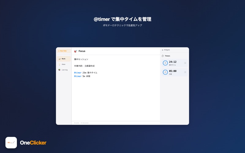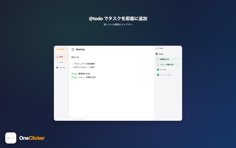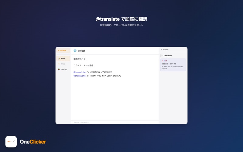 OneClicker は、作業の流れを止めない macOS 向けスマートノートアプリです。 シンプルなホットキー(Control キー2回タップ)で、どのアプリの上にもオーバーレイ画面が瞬時に表示。集中を途切れさせることなく、強力な生産性機能にアクセスできます。 ■ 8つのパワフルな機能 【@ai】AI質問 Apple Intelligence を活用し、その場で疑問を解決。調べ物や文章作成のサポートに。 【@timer】タイマー 25m、1h30m など自然な入力でカウントダウンタイマーを設定。時間が来ると通知でお知らせします。 【@remind】リマインダー 特定の日時や相対時間(30分後、明日9時など)でリマインダーを設定。大切な予定を忘れません。 【@todo】TODO管理 タスクの追加・完了をコマンド一つで。シンプルで直感的なTODO管理を実現します。 【@calc】計算機 数式を入力すると即座に計算結果を表示。Tab キーで結果をメモに挿入できます。 【@snippet】スニペット よく使う定型文を保存して、いつでも素早く呼び出し。メールやコードの雛形管理に最適。 【@translate】AI翻訳 17言語に対応したリアルタイム翻訳。英語、日本語、フランス語、スペイン語、ドイツ語、中国語、韓国語など、幅広い言語間で瞬時に翻訳します。 【@today / @now / @tomorrow】日時挿入 今日の日付、現在時刻、明日の日付をフォーマット済みで即座に挿入。議事録作成やログ記録に便利です。 ■ こんな方におすすめ • 複数のアプリを行き来する作業が多い方 • 思考の流れを大切にしたいクリエイター • 効率的なタスク管理を求めるビジネスパーソン • 素早いメモとコマンド実行を両立したい開発者 • Mac を使った生産性を最大化したい全ての方 • 効率化を大切に生産性を向上させたい方 ■ 主な特徴 • Control キー2回で即座にアクセス • どのアプリの上にも表示されるオーバーレイ型 • @コマンドによる直感的な操作 • Apple Intelligence によるAI機能 • 軽量で高速な動作 • macOS に最適化されたネイティブアプリ • 日本語・英語の完全対応 ■ 動作環境 • macOS 26 以降 • Apple Intelligence 機能は対応デバイスが必要です 作業効率を劇的に向上させる、新しいメモ体験を OneClicker で。