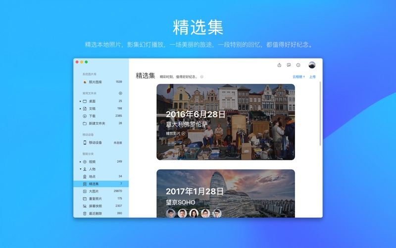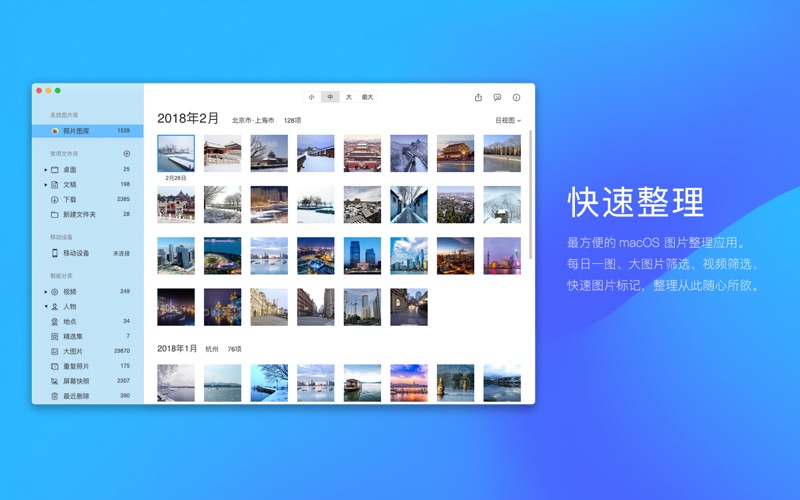 Kantu (看图) 是腾讯在 macOS 平台出品的优质看图工具,轻轻松松从万张照片中找到你想要的。 【图片管理】可以管理 “ 照片 ” 、“ 下载 ” 位置下的图片,进行重命名、删除、移动等操作,也可以手动添加其他位置。 【高级整理】可以为图片评级、筛选大体积图片或视频。 【外接设备】直接查看和导入外接设备中的图片,支持手机、相机和 PTP 设备。 【每日一图】用时间视图来回顾生活点滴。 【人脸识别】自动识别照片库中的人脸并聚合查看。 【地点聚合】按照地理位置聚合,轻松查看旅行照片。 【重复照片】智能识别重复相片,支持批量删除一键瘦身。 【精选影集】智能生成精选事件,记录美好回忆。 【快速找图】支持按照文件名、日期、地点、场景等查找相片。 修复稳定性的问题 修复用户反馈的问题