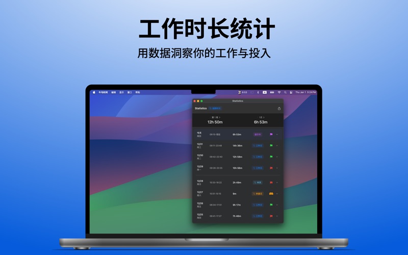 牛马时间是一款适合打工人的菜单栏工时记录器,简单高效、数据安全,开盖/解锁即开始,合盖/锁屏即暂停,洞察你的工时与投入度。 • 自动无感:解锁/锁屏自动计时 • 隐私优先:数据仅保存在本地 和 iCloud • 活跃时长 / 在岗时长清晰区分 • 每日目标与完成状态 • 夜猫子模式(自定义一天开始时间) • 日/周/月统计 • 完整 CSV 导出(Pro) • 开机自启,一次设置就不用管 适合想轻松了解真实工作时间、又不想手动计时的互联网打工人。