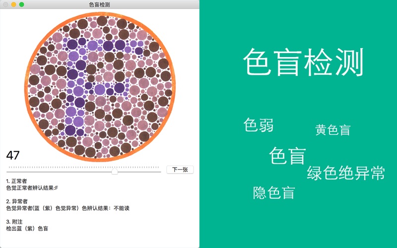 完整而科学的色盲检测图谱,并拥有正常和非正常两种结果展示,在驾校体检等检验前,能提前自检的一个健康检测工具。 1 能检出色盲、 色弱(重、中、轻) 2 能分辨的色盲种类包括 (红、黄、绿、蓝、紫) 3 拥有三种机制交替检测 (数字、字母、图形)