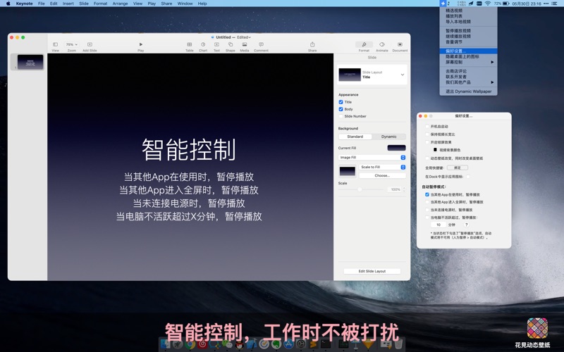 花見有着5000+的4K动态壁纸,如果您还在寻找Mac下的动态壁纸,不要犹豫,花見就是您想要的!素材中心在持续更新,总有适合你的风格。 在花見中,你既可选择App内现有视频素材,也可导入本地视频,同时可以将视频设置为您的电脑屏保,当然,花見会尽可能少占用系统资源,影响到用户的体验。花見现推出一系列独家壁纸,和Wallpaper Engine上优秀的壁纸创作者合作,欢迎下载体验。 我们还设计了很多小功能: ● “智能控制”,在使用其他App时自动暂停,工作时不被打扰。 ● “休息提醒”,自定义提醒时间,避免眼部和大脑疲劳。 ● “定时切换”,每半小时/一小时/每天自动切换素材。 ● 支持多显示器,不同屏幕设置不同壁纸。 ● 支持隐藏桌面图标,浸入式的体验。 ● “全局快捷键”,一键切换壁纸、隐藏桌面图标、显示屏保。 零App学习成本,简洁的交互,追求最好的体验。 用户评论: “最好用的动态壁纸软件,其他软件没得比,简直弱爆了,花見的壁纸很多,非常方便选择,功能很强大,外加上团队感觉是很用心的,每次升级都能给软件更好更方便的使用体验,对于问题的回复也很用心很实在,非常棒。” —— Zodiac Sheldon “一定要支持一下!软件体验很不错,壁纸更新很快,画质也有了提高,最新出的鬼刀动态壁纸真的太好看太喜欢啦,忍不住过来给个好评,日常打开电脑就想先看看有没有新出的壁纸,对我这种壁纸狂魔一天不换都难受的人太友好了,希望开发者继续多出新的酷炫壁纸!” —— Kimentanm “第二次前来自行5分评价,第一次的评价是建议多更新,开发大大还回复了,看了下其他评价,开发大大基本每个评价都会回复,为工作态度点赞~买之前其实有点担心更新频率的问题,不过现在发现更新得还蛮新快的,例如有最近比较火的鬼灭之刃。就很喜欢~~所以特来支持下,加油哟!” —— Rikka.Sora "Works like a charm. Lets me play videos as my wallpaper and overall is easy to use. I would suggest to anyone looking for a wallpaper engine like software for mac." —— mono.mirrorz "This is a great alternative for Wallpaper Engine and is also incredibly easy to use. The wallpapers are beautiful and clear. The app is updated with different backgrounds often as well. I highly recommend if you have been looking for an app that offers beautiful, dynamic wallpapers! :)" —— HelloMyNameisNickel 订阅说明: 要完全访问所有功能,您需要订阅解锁完全版:- App内全部动态壁纸 - 后续更新的动态壁纸 - 储存壁纸素材到本地 - 解锁“系统动态屏保” - 解锁“软件内动态屏保”功能 - 解锁“休息提醒”功能 - 导入本地视频作为壁纸 - 去除广告 - 订阅周期:• 1个月15元 • 6个月68元 • 12个月118元。 - 付款:用户确认购买并付款后记入 iTunes 账户。 - 取消续订:如需取消续订,请在当前订阅到期 24 小时以前。 - 续订:苹果 iTunes 账户会在到期前 24 小时内扣款,扣款成功后按订阅周期顺延。 - 用户购买订阅之后,需要手动在iTunes/Apple ID 设置管理中关闭/切换自动续订功能。 - 有任何问题,请联系我们:wen646729740@gmail.com。 隐私政策: https://hongkongossofwhbalzac.oss-cn-hongkong.aliyuncs.com/privacy/LiveWallpaper/Privacy_Policy.html 使用条款: https://hongkongossofwhbalzac.oss-cn-hongkong.aliyuncs.com/privacy/LiveWallpaper/Terms_of_Use.html 增加更多丰富有趣的壁纸。