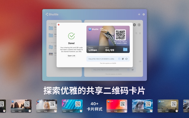 Shuttle:简单,快速,轻便,方便的文件共享 只需选择或拖拽文件夹,Shuttle将启动HTTP文件服务器, 其他人便可以访问、下载、上传,以及预览文件。 Shuttle可生成精美的二维码卡片,方便您共享文件给他人。 ▶ 特点 • 传输任何文件类型而不更改原件 • 无需安装任何应用程序即可获取共享文件 • 无需下载可播放视频、图片 • 将文件共享到其他计算机,手机和平板电脑 • 无平台限制,支持多种系统,手机、电脑都可存取文件 ▶ 何时使用 Shuttle • 当您想使用手机直接查看在Mac上的视频、图片时 • 当您身边没有U盘等存储设备时 • 当您想要立即发送文件时 • 当其他人不想安装任何应用程序来获取文件时 • 在向其他手机迁移照片,视频和音乐时 • 当您需要在朋友、同事之间发送大文件时 ===== 您的订阅包括免费试用期,免费试用期在您的iTunes 帐户确认购买后开始。试用期结束后,您的订阅将自动开始并自动续订。除非您在当期结束前至少24小时在您的账户设置中禁用自动续订或取消您的订阅,否则您的iTunes 账户将收取下期费用。有关条款与隐私政策,请访问: https://www.swiftwave.cc/terms-privacy Fix bugs