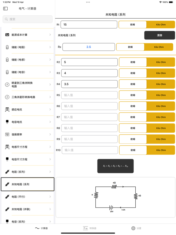 全球下载量已超过13,600次! 电气计算器是一款功能强大的工具,适用于电气工程师、电工、学生及电气爱好者,提供从基础到高级的各类电气计算,包括电压、电流、功率、阻抗、导线选择、变压器等实用功能。 可用计算功能列表: 基础电气计算: • 电压计算器 (Ω) • 电流计算器 (Ω) • 电阻计算器 (Ω) • 功率计算器 (Ω) • 电压降计算 • 导线尺寸选择器 阻抗计算(R-L-C): • 阻抗计算器 R-L-C • 电阻和电感串联 • 电阻和电感并联 • 电阻和电容串联 • 电阻和电容并联 • 电感和电容串联 • 电感和电容并联 • 电阻、电感、电容串联 • 电阻、电感、电容并联 功率与电流: • 单相功率 • 三相功率 • 单相电流 • 三相电流 • kVA 转 安培(单相) • kVA 转 安培(三相) • 安培转 kVA(单相) • 安培转 kVA(三相) 变压器计算: • 变压器电流计算 • 变压器电压计算 马力与电流: • 直流马力 • 单相马力 • 三相马力 • 直流电流(马力) • 单相电流(马力) • 三相电流(马力) 效率与功率因数: • 直流效率 • 单相效率 • 三相效率 • 单相功率因数 • 三相功率因数 照明计算: • 光强度 • 光通量 • 立体角 能量与存储: • 电费计算 • 能量存储(电阻) • 能量存储(电感) • 能量存储(电容) 星形与三角形转换: • 星形转三角形 • 三角形转星形 电抗与谐振频率: • 电感性电抗 • 电容性电抗 • 谐振频率 • 电感尺寸计算 • 电容尺寸计算 串联与并联计算: • 串联电阻 • 并联电阻 • 串联电感 • 并联电感 • 串联电容 • 并联电容 • 未知电阻(串联) • 未知电阻(并联) • 未知电容(串联) • 未知电容(并联) 其他工具: • 直流发电机计算器 电气单位转换器: • 电场强度 • 电势 • 电阻 • 电阻率 • 电导 • 电导率 • 电容 • 电感 • 电荷 • 线电荷密度 • 表面电荷密度 • 体电荷密度 • 电流 • 线电流密度 • 表面电流密度 • 功率 立即下载,让您的电气计算更快速、更准确、更智能! 新增对 iOS 26 的支持。 新增电阻色环功能。