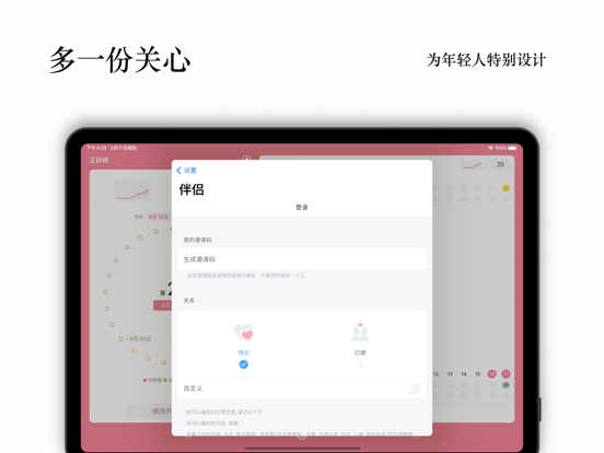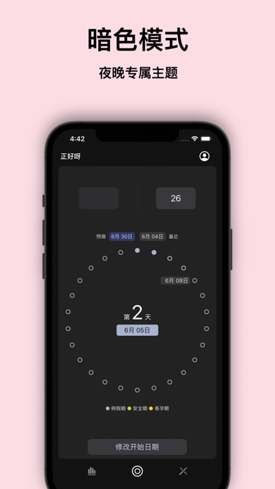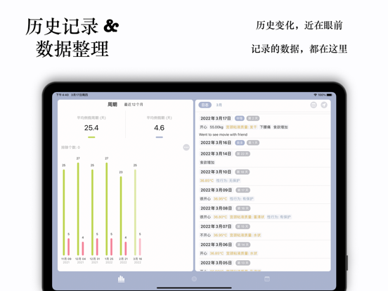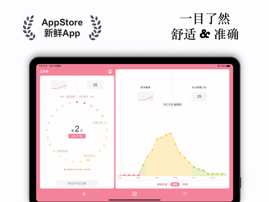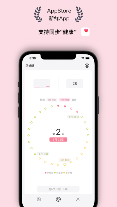 支持iPhone,iPad 和 Mac ~~ 入选苹果精品推荐栏目【新鲜App】~~ ● 支持同步iOS “健康”,打开“健康”后可以同步多种数据,记录姨妈更快捷 ● 连接伴侣的账号,自定义伴侣的权限,预测排卵日,易孕期,安全期,辅助您规划自己的备孕计划或者避孕计划 ● 桌面小组件,通过桌面小组件即可方便观察到大姨妈还有几天到来,多种主题色可供选择 ● 丰富的数据记录功能,包括流量,心情,症状,基础体温,点滴出血,宫颈粘液质量,排卵测试,体重,药物服用,体重和笔记 ● 自主分析,打开自主分析模式后,App会自动根据你的基础体温和排卵测试数据分析调整经期预测。 ● 异常数据排除,打开周期自动计算模式后,App会根据你最近12个月的经期数据自动计算平均值,并排除异常数据。当然,你也可以根据自己的需要手动地排除或包含某次数据。 ● 自定义功能显示,所有以上的各种记录功能,都是可以自定义显示的,不需要的可以隐藏,你也可以根据需要调整显示顺序 ● 基础体温图表,在这张图表中,还汇集了心情,性行为,宫颈粘液质量,排卵测试数据,在查看体温变化的同时,还能够非常直观的看到每一天的其它重要数据。 ● 年份日历的快速浏览和查找,通过年份日历视图,你可以非常直观快捷的查看细微到每一天的数据分布,通过顶部的5个类型切换按钮,你还可以快速切换查看其它类型的数据分布。 ● 月份日历的条件筛选,在月份日历视图,你可以通过点击底部的三个代表不同数据类型的按钮,在日历视图中直观的查看每一天所包含的各项数据。 ● 辅助功能:受孕概率变化预测,App会基于对各项数据的分析,绘制出未来一段时间内的可能的受孕概率变化趋势图,如果本次周期存在药物服用的记录,则会自动关闭易孕期的分析。 ● 计数模式,对于部分经期较为规律且对自己的身体变化十分熟悉的用户,可以通过查看该天在周期中是第几天来快捷地判断可能的身体变化。 ● 主题色切换和暗色模式,App特别为暗色模式进行了适配,可以根据自己喜好切换 更多精彩功能敬请期待! *** 关于App中的“高级会员”订阅服务 *** 1.服务名称:正好呀App-高级会员 2.订阅周期:1年 3.订阅价格:当前该服务价格为每年28元,当价格发生调整时,新的价格将在您下一个订阅周期生效 4.您在订阅服务后能获取到的权益:解锁所有高级功能,解锁未来所有App高级功能 5.购买自动续费服务后,会在每个计费周期到期前24小时,自动在iTunes账户扣费并延长该计费周期对应的会员有效期 用户使用条款: https://www.zhenghaoya.fit/#/terms 联系我们: 电子邮箱:support@zhenghaoya.fit Twitter: @HaoyaApp 微博:@正好呀ya 1,适配新系统