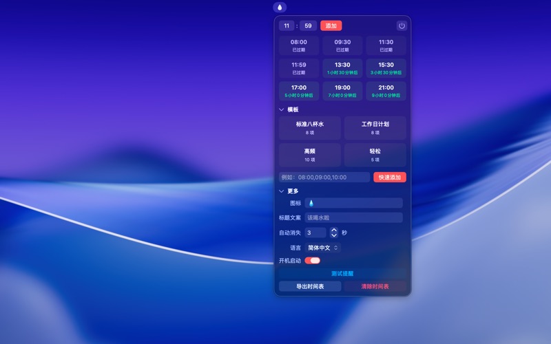 Schedule Drink 帮助你按照预定的计划补充水分。 你可以设置一天中具体的喝水时刻(例如 09:30, 11:00, 15:00),让提醒更加符合你的生活规律,而非简单的循环倒计时。 功能特点: 按计划提醒 支持设定任意数量的具体时间点,灵活安排一天的饮水节奏。 一键导入 内置了“工作日”、“日常”等常用时间表,也可以快速导入你自己定义的时间列表。 安静不打扰 提醒窗口在屏幕上方自动浮现,几秒后自动消失,无需任何操作,不打断当前工作。 UI 细节更新。