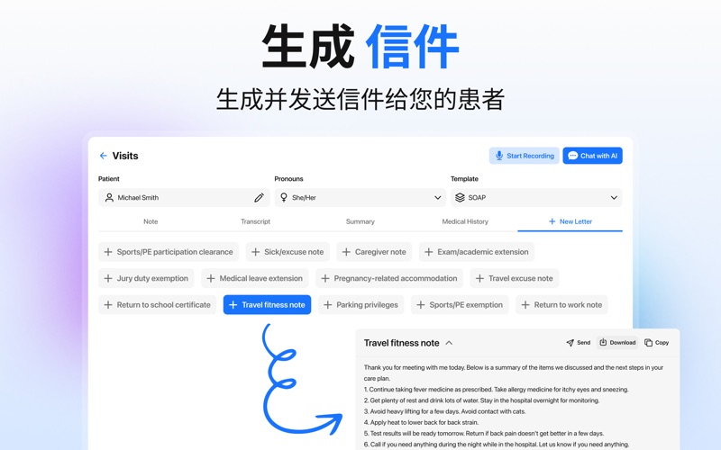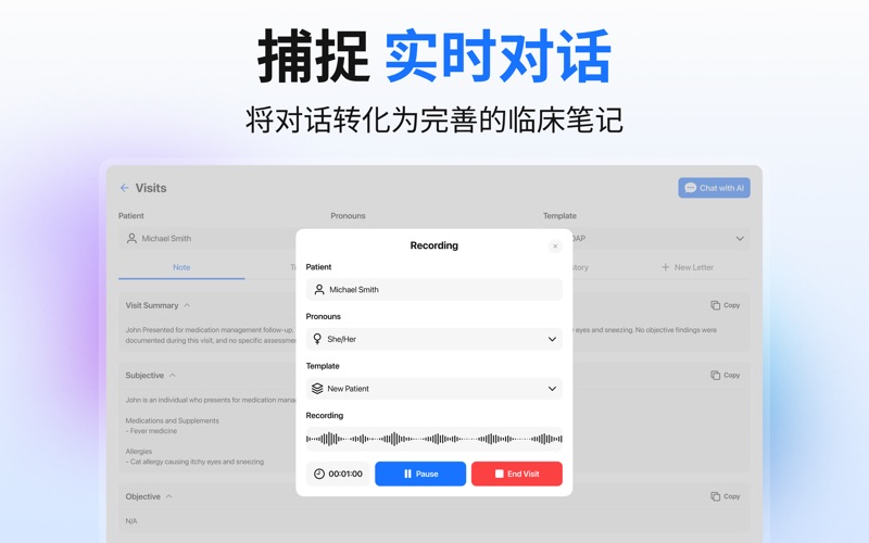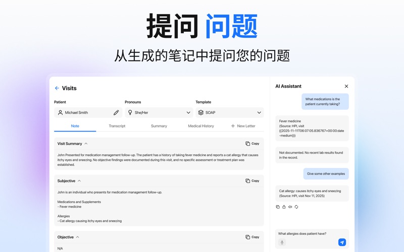 AI临床笔记助手,您的全能AI文档助手 借助AI临床笔记助手,临床医生只需几秒钟即可创建清晰、完整且专业的临床笔记,且准确性和质量丝毫不打折扣。这款应用专为医生、治疗师、执业护士、医学生以及所有医疗保健从业人员设计,通过智能自动化彻底革新您的日常病历记录流程。 无论您是撰写SOAP病历、生成就诊总结、转录临床诊疗过程,还是整理患者病史,该应用都能提供快速、可靠且结构化的文档,满足您的个性化需求。 AI临床笔记助手的功能 • AI即时生成临床笔记 • 无需再花费数小时打字。只需输入关键信息或口述您的患者互动即可。 • AI即时生成完整、结构化且专业的笔记。 • 非常适合繁忙的诊所、远程医疗、日常查房或下班后记录病历。 专业 SOAP 病历生成 轻松创建清晰、条理分明且符合医学规范的 SOAP 病历: • 主观:自动总结患者主诉和病史。 • 客观:清晰呈现临床发现。 • 评估:生成简洁的临床评估。 • 计划:输出治疗计划和后续指导。 医学转录和语音输入支持 录制或输入您的病历,AI 会将原始信息转换为格式完整的临床文档。非常适合记录咨询、评估、治疗过程和检查。 高级就诊总结 生成每次患者就诊的准确详细总结。 有助于查阅病历、更新电子健康记录 (EHR) 以及在随访期间快速参考。 智能患者病史管理 在一个地方轻松保存、整理和访问过往的临床病历。跟踪之前的就诊记录,比较进展,并确保护理的连续性。 注重隐私和安全 您的病历始终受到保护。该应用程序采用注重隐私的工作流程设计,旨在帮助临床医生安全、负责地创建文档。 您的临床文档智能助手 无论您是准备 SOAP 病历、转录患者就诊记录、创建摘要还是管理医疗文档,AI 临床笔记助手都能精准、快速地简化您的工作流程。 免责声明:AI 临床笔记助手应用程序仅供临床医生记录病历之用。它不提供医疗建议、诊断或治疗。本应用程序生成或记录的内容仅供参考和记录之用,不应被视为替代专业医疗判断。如有任何关于医疗状况的问题,请务必咨询合格的医疗保健专业人员。切勿因本应用程序获取的信息而忽视或延迟寻求专业医疗建议。 使用条款:https://sites.google.com/view/ammaraashrafapps/privacy-policy 隐私政策:https://sites.google.com/view/ammaraashrafapps/terms-of-use 最终用户许可协议 (EULA):https://sites.google.com/view/ammaraashrafapps/eula 错误修复和一些小改进