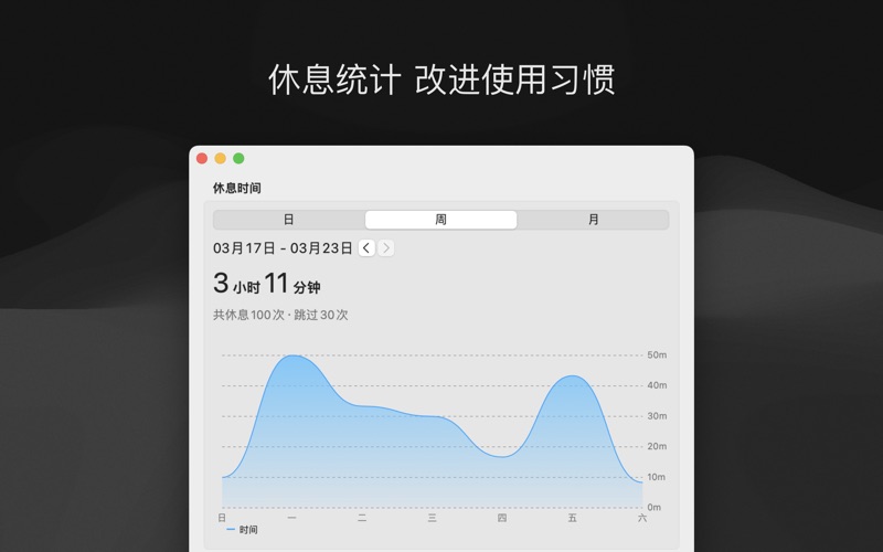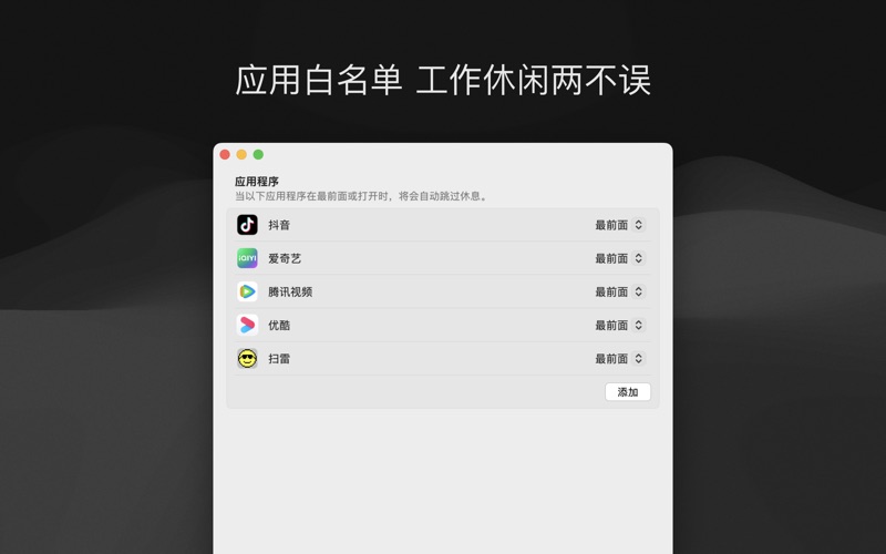 一休可以提醒你适当的休息,减少久坐对身体的伤害,提高工作效率。 ◎ 自定义计划 支持番茄工作法 ◎ 自定义动画 支持 GIF/PNG/Lottie ◎ 应用白名单 工作休闲两不误 ◎ 休息统计 改进使用习惯 一休会员自动订阅说明 • 成为一休会员,你可以解锁所有付费功能,享受未来的免费更新,以及承诺没有广告。 • 确认购买并支付后,将通过您的 iTunes 账号自动续订。苹果 iTunes 账户会在到期前24小时内扣费,扣费成功后订阅周期顺延一个订阅周期。如需取消续订,请在当前订阅周期到期前24小时以前,手动在 iTunes/AppleID 设置管理中关闭自动续费功能。试用期内,iTunes 账户如不取消订阅,则会在试用期结束时自动开通订阅并扣款,未使用的试用时长在购买订阅之后将会自动作废。本服务由您自主选择是否取消,若您选择不取消,将为您开通下一个计费周期的续费服务。 隐私政策: https://charming-tarantula-ceb.notion.site/cce12918e432406a820a3e90c3393205 用户协议: https://charming-tarantula-ceb.notion.site/eb652905b10b48928fb981a3af4a9f91 1、新增自定义提示声音功能 2、提升用户体验