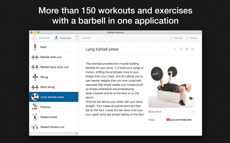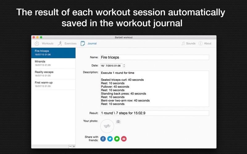 杠铃锻炼 - 你最好的杠铃教练 加快新陈代谢,发展耐力和爆发力,提高心脏工作,赶走低落和抑郁症? 这一不寻常的程序是在你的锻炼一个伟大的帮手 - 无处不在,随时随地。 用它小心,吃得干干净净,努力工作 - 和结果什么都没有做,除了抓住你。 - 该应用程序包含7个锻炼节,每节有15个训练,没有重复。 - 每节有5个难度级别 - 每一个运动都有详细的描述,照片和视频指令; - 精加工锻炼后,你可以分享到Facebook,Twitter和其他社交网络的结果。 - 105锻炼,没有重复。 - 你可以选择在任何一节段和锻炼 好运气在你的锻炼! Some bugs fixed Small design changes