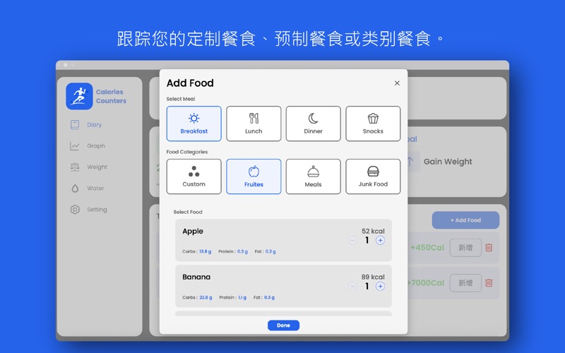 卡路里计数器饮食追踪器可帮助您轻松监控每日膳食、卡路里和营养。设定个人目标,追踪进度,并在健身之旅中保持动力。简单、智能、有效,您更健康生活方式的口袋伙伴! Subscription Details Subscription payments will be charged to your iTunes account upon purchase confirmation and at the start of each renewal term. Subscriptions with a free trial period will automatically renew to a paid subscription unless canceled. To avoid charges, cancel your subscription or free trial in iTunes settings at least 24 hours before the end of the current subscription period. The cancellation takes effect the day after the last day of the current period, and you will be downgraded to the free service. Any unused portion of a free trial will be forfeited when you purchase a premium subscription during the trial period. * Privacy Policy: https://docs.google.com/document/d/1LAUT2rS0Ico3AvdcKbeT6ckS2HTUbOvwakKj4G6x-mA/edit?pli=1 * Terms of Use: https://docs.google.com/document/d/14CVCmzGCD3cB6HEyuMf9Boa4G53PxoC01dGALSQQYqA/edit - Improve App Performance
