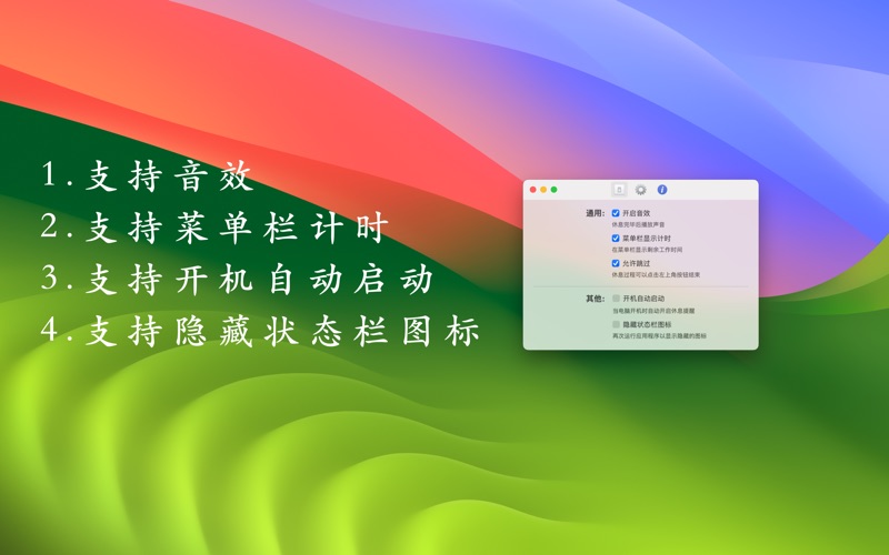 使用「Nap - Break Reminder」定时提醒、缓解疲劳、提醒喝水、避免久坐、管理时间、提升工作效率... 特色功能: 1. 提醒定时休息 2. 提醒定时喝水 3. 工作时长可定制 4. 休息时长可定制 5. 提示文案可定制 6. 背景图片可定制 7. 支持长休息 8. 支持音效 9. 支持菜单栏计时 10. 支持开机自动启动 11. 支持隐藏状态栏图标 极简、无内购、无广告! 持续优化功能,提升使用体验。