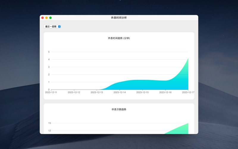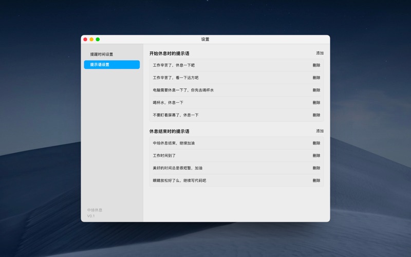 休息提醒保护时间 - 中场休息是一个以提醒休息为核心的 mac app。 一直在忙于工作,以至于忘了休息,忘了喝水,忘了站起来走走?安装上『休息提醒保护时间 - 中场休息』,我们将按照你设定的时间,按时准时提醒你。 你可以设置固定的时间提醒,或者设置一个间隔时间持续提醒,当休息时间到了后,你的屏幕上将会显示一个休息提醒的全屏界面,这时,你需要休息一下了。 主要功能 - 定时提醒设置,可以设置固定时间,或者按照时间间隔来设置提醒 - 全屏提醒,你不可以再工作了,休息一下吧。 - 提醒语完全自定义,提醒喝水可以,提醒往往远处保护眼睛也可以,提醒上厕所也没问题,由你来定。 - 古典美,在全屏提醒界面上,我们会随机显示一副国画和一首诗,赏心又悦目。 - 休息时间的统计功能,看看你在哪段时间工作太繁忙了。 以上,就是这个新生 APP 的介绍,快来试试吧。欢迎给我写信 defcc@icloud.com,你的意见和建议对我很重要。 本次版本更新 功能优化和 bug 修复,提升了稳定性