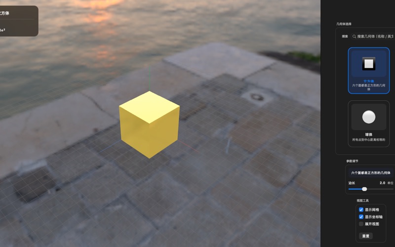 7种经典几何体 立方体:可调节边长,观察正六面体的完美对称性 球体:调整半径,理解球面的曲率特性 圆柱体:自定义半径和高度,探索圆柱的侧面积和体积关系 圆锥体:调节底面半径和高度,学习圆锥的母线和展开扇形 四棱锥:设置底边和高度,认识棱锥的空间结构 三棱柱:调整底边和高度,理解棱柱的侧面展开 圆环:自定义内外半径,探索甜甜圈形状的数学奥秘 实时参数调节 直观的滑块控制,实时预览几何体变化 精确数值输入,满足教学演示需求 参数范围保护,确保几何体的合理性 展开图演示 流畅的动画展示几何体如何从3D展开为2D 支持立方体、四棱锥、三棱柱的完整展开过程 帮助学生建立空间想象力,理解立体与平面的转换关系 可视化辅助 可选网格系统,建立空间坐标感 三维坐标轴显示,标识 X、Y、Z 方向 精美的金色材质渲染,提升视觉体验 流畅的 3D 旋转和缩放操作