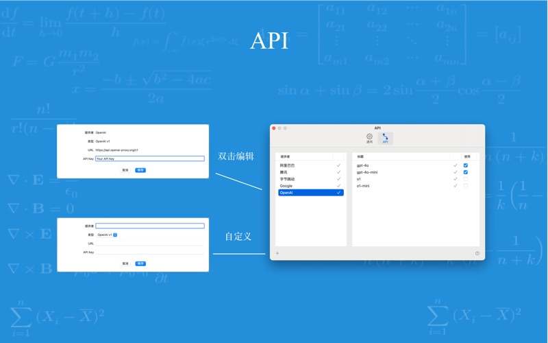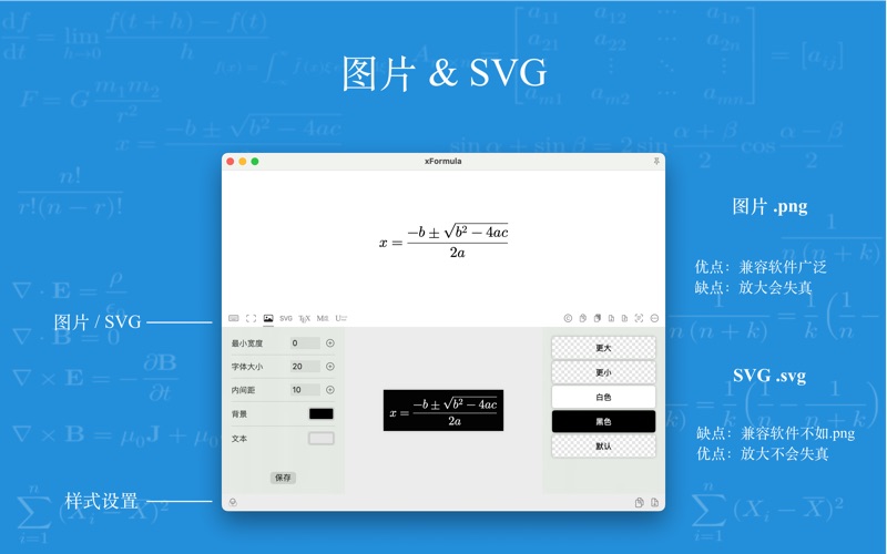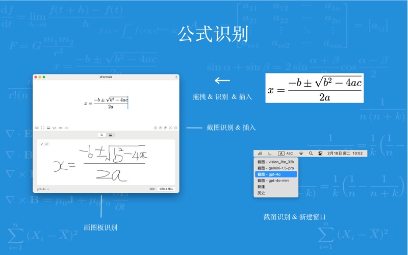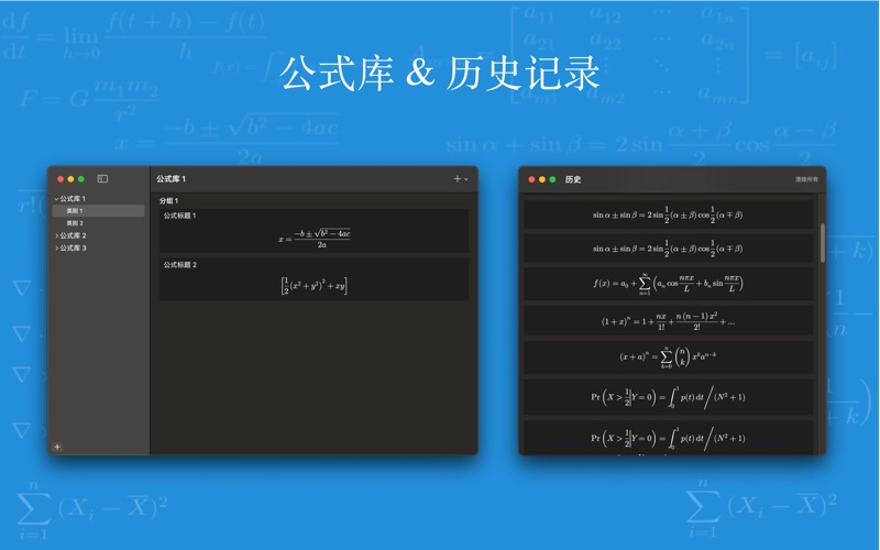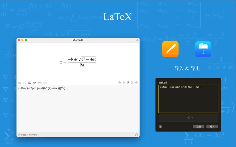 这是一个可以在Mac上使用的数学公式编辑器,可以导出图片, LaTeX, MathML, UnicodeMath。编辑器里包含了变量,运算符,关系符号,括号,下划线,上划线,重音符号,开方,分式...... 如果需要那么就下载试一试吧。 ------ 功能 ------ 1. 数学公式可视化编辑 2. 导入导出 - LaTeX: 导入导出;相关软件有 Pages, Keynote - MathML: 导入导出;相关软件有 Pages, Keynote - UnicodeMath: 导入导出;可以将 UnicodeMath 代码导入 Word 生成公式,也可以将 Word 中公式的 UnicodeMath 格式的代码到 xFormula 进行编辑 - 图片: 点击键盘上的图片按钮,可以生成一张图片,图片可以复制到你想粘贴的地方 - SVG: 导入导出;一种矢量格式的图片,放大缩小不失真 3. 图片识别 - 集成自己喜欢的大模型 API,识别图片中的数学公式 - 大模型的数学公式识别越来越好,但由于数学公式的LaTeX命令十分多,会出现同一个符号不同的命令等一些情况,xFormula还不能支持所有的LaTeX命令,所以会出现一些异常的情况,但是我们会在后续版本中不断优化并兼容更多命令 4. 数学公式库: - 您可以同时创建几个公式库,每个公式库可以单独的导出导入 - 每个公式库下面可以有很多分类,每个分类下面可以有很多分组,每个分组下面可以创建,编辑公式 - 示例1:高中数学公式库 > 分类1: 集合,分类2: 几何, 分类3: 代数 - 示例2:初中数学公式库 > 分类1: 有理数,分类2: 三角函数, 分类3: 几何 5. 数学样式 - 公式的显示样式取决于选择的数学字体,由于字体设计的原因,数学公式可能会有一些像素间距的瑕疵,每种字体也会有一些数学字符不支持,请酌情选择使用。 6. 自定义键盘 - 从小学,初中,高中到大学,每个阶段使用的数学符号频率都不一样;集合,极限,矩阵,函数,每个知识范围使用的符号频率也不一样。所以如果您长期使用,或者高频率使用,推荐创建一个适合自己的输入符号键盘,这要比通用键盘的效率更高,节省更多时间。 7. 软件内置帮助文档,详细介绍了关于键盘输入,导出公式到 Pages, Keynote 等软件的操作。 更多问题,欢迎随时评论留言或者发送反馈邮件。( PS: 留言时,如果您能给个好评,我们会很受鼓舞的,谢谢。) 软件提供免费下载是希望用户在购买之前知道此软件都有哪些功能,是否有用,试用一下再决定是否购买。 由于第一次发布此软件的时候,iOS 和 macOS 的付费方式并没有统一,所以 xFormula (iOS) 和 xFormula (macOS) 是需要分开付费的。 分开付费的优势是定价拆分,即如果您只有Mac,而没有移动端,那么就可以省去移动端的购买费用。( 如果合并,那么定价也会是现在两者定价之和 )。 使用条款 : https://www.apple.com/legal/internet-services/itunes/dev/stdeula/ 隐私政策: http://guizhenjiaoyu.com/xformula/zh-Hans/privacy.html - 细节优化 & 问题修复