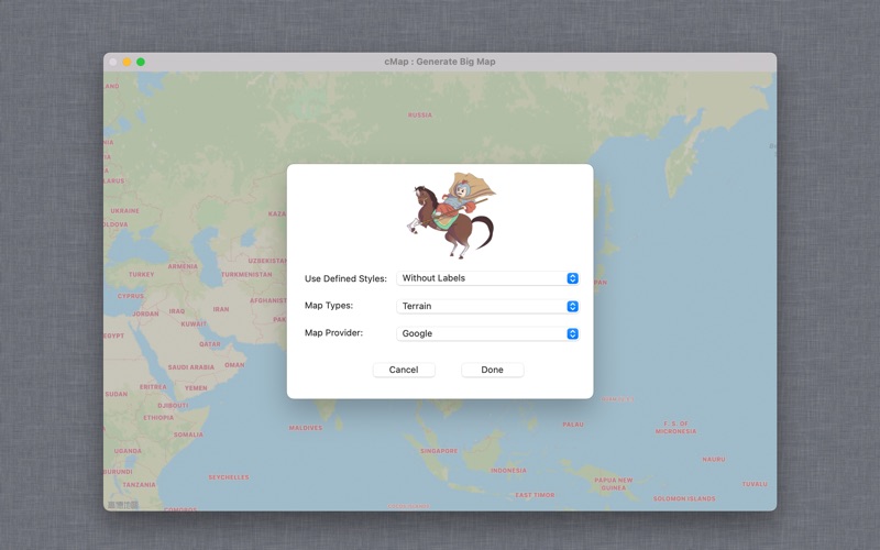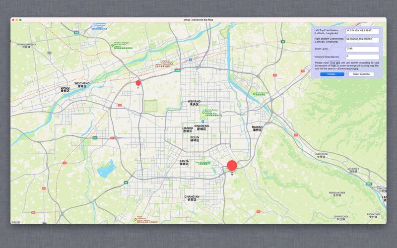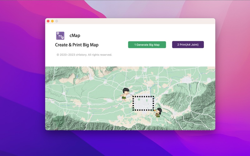 创建 & 打印大幅面地图,可以打印世界上任何地方的地图,比如巴黎、西安、罗马,还可以设置不同的地图缩放级别。 使用步骤如下: 1. 指定打印区域的左上角、右下角经纬度坐标,及地图缩放级别。 2. 软件自动生成大幅面地图。 3. 可以将地图打印到多张A4纸上,最后拼接成一幅大地图。 为MacOS 14.x操作系统做了优化,以适配佳能G580大地图的打印。之前的版本不兼容。