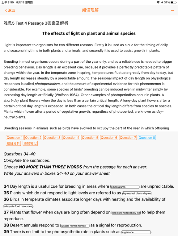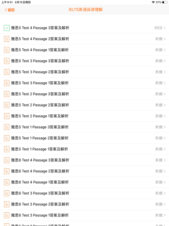 雅思英语阅读理解模拟训练,为您提供了大量官方雅思试题和模拟试题,让您在规定时间内进行模拟练习,助您轻松备考雅思阅读理解考试。 特色功能: 1. 大量试题资源: - 我们汇集了几百套官方雅思试题,确保您能够真实感受到考试环境和难度。 - 题库会不断更新,以保持与最新考试标准的一致性。 2. 试题解析功能: - 在完成练习后,您可以立即查看题目和答案解析, 解析会解释文章中的重要概念和关键信息 帮助您理解文章和分析对错。 3. 定时模拟练习: - 设定合理的考试时间限制,模拟真实考试场景,提高您的时间管理能力。 4. 内置词典: - 您可以随时查询单词,获取详细解释,并可编辑解释,加入自定义内容。 5. 生词库管理: - 在做题时遇到陌生单词可将它们轻松加入生词库,随时进行复习和背诵,扩展您的词汇量。 - 生词库可随时备份到iCloud云端。 6. 笔记功能: - 您可以在应用内创建和管理阅读理解笔记,帮助您整理思维和总结重要信息。