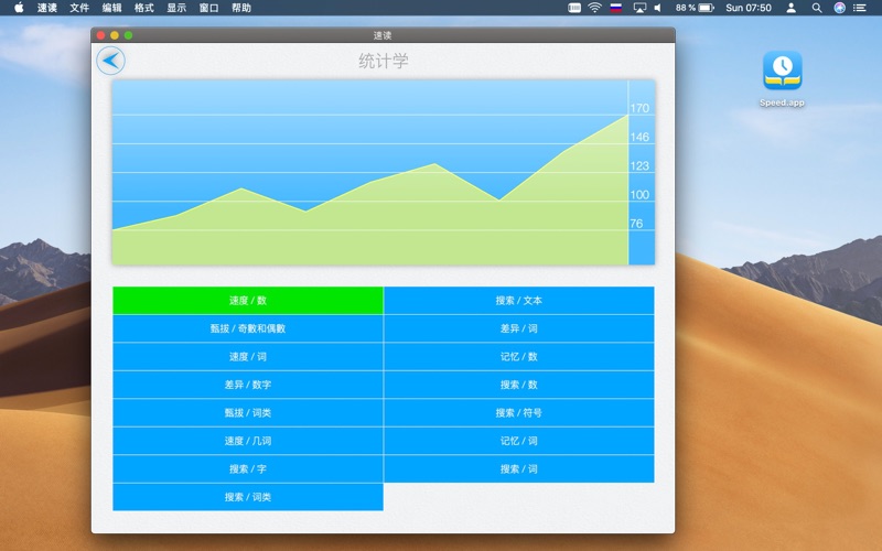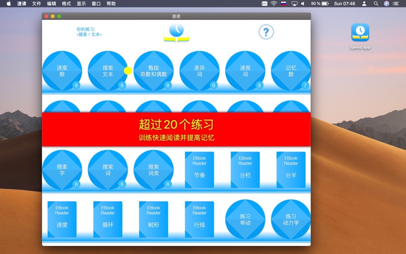 两周后阅读速度提高150%。增强记忆力。 阅读讲课笔记、书籍和新闻比其它人更快。 超过20个练习可发展快速阅读技能和记忆力。某些练习支持ePub书籍。训练自己的能力,阅读最喜爱的书籍,同步完成!本应用已被译为13种语言:英语、西班牙语、意大利语、马来语、印度尼西亚语、朝鲜语、葡萄牙语、土耳其语、日语、汉语、俄语、法语和德语! 记住,若你希望将阅读速度提高几倍的话,请完成所有每日练习。