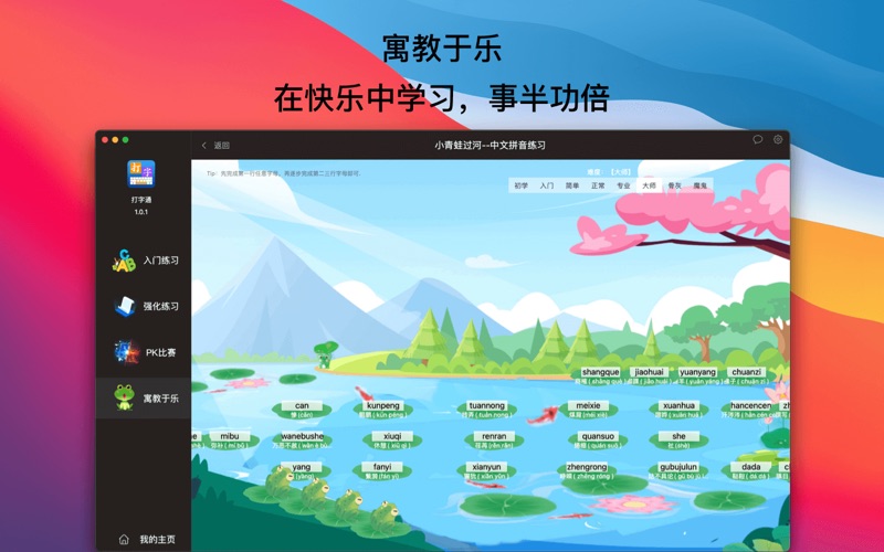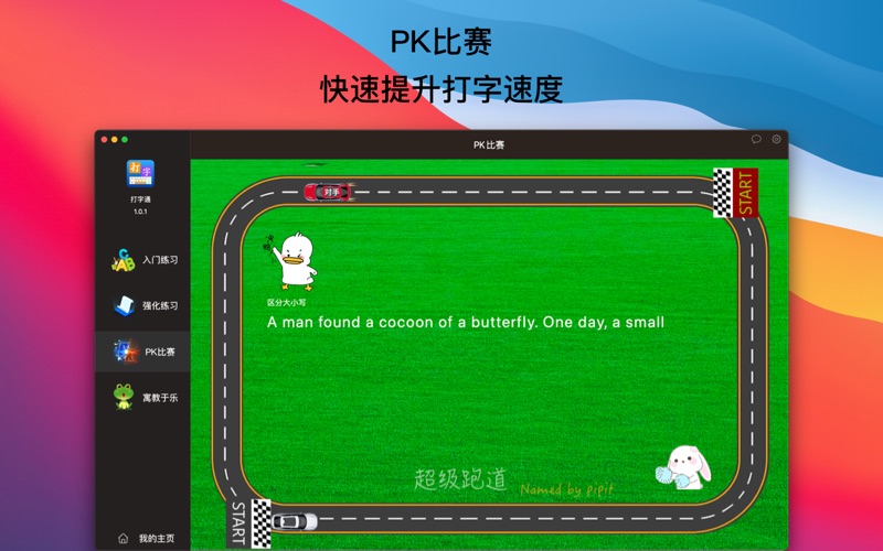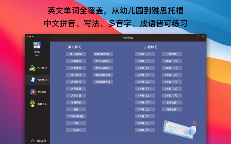 打字通 - 打字练习软件 此软件是专门针对中文和英文使用者研发的学习软件,既可以练习英文,也可以学习中文拼音打字。 主要包含: 1、入门练习 2、强化练习 3、PK比赛 4、寓教于乐。 入门练习打字,可以从零基础打字练习,键盘分布练习,键盘分布练习可以针对每一个指头专门练习对应的字母。 加强练习专业版可以练习各行各业专用词汇。针对不同行业的从业人员。 强化练习:包含从幼儿园到小学英语,中学英语,高中英语,大学四级单词,大学六级单词,考研词汇,雅思,托福,GRE,GMAT,MBA联考,专四专八词汇,BEC商务英语,英语翻译考试词汇。 拼音包含,小学,初中,高中的生词词汇。用户也可以练习,听单词和默写相关词汇。 PK比赛:可以根据不同的水平参加比赛,提升打字速度的同时增强单词熟练度。 寓教于乐:包含极速射击中文拼音,疯狂打幽灵中文拼音,小青蛙过河中文拼音,极速射击美英单词,疯狂打幽灵美英单词,小青蛙过河美英单词。 本软件作为专业的打字软件,希望帮助您提升打字速度,优化打字效率。 - 新增英文和中文文章练习; - 修改王国PK赛练习内容; - 优化使用体验; - 修复已知bug;